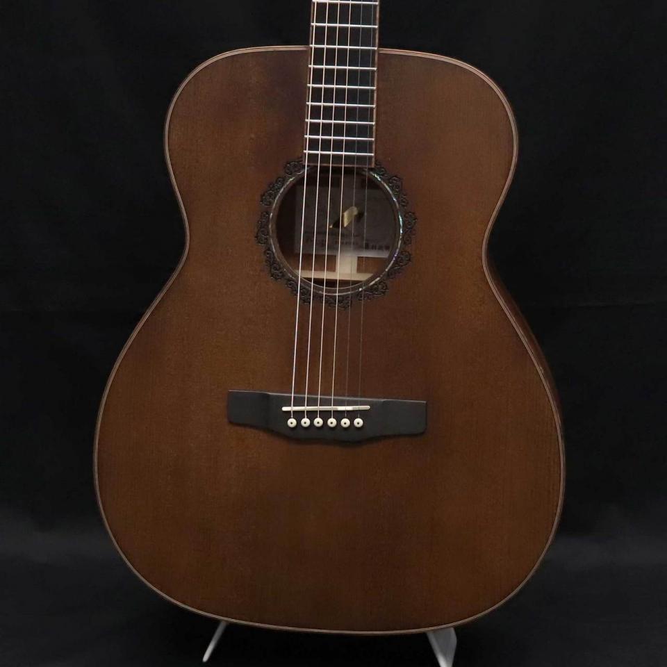 "ロゼッタ部にレーザーで焼印の様な模様を施した特徴あるモデル。木材本来の鳴りを最大限に生かす為、シルクフラット塗装の採用や、オープンタイプのペグの採用などを行い、楽器自体が非常に軽量に仕上げられています。