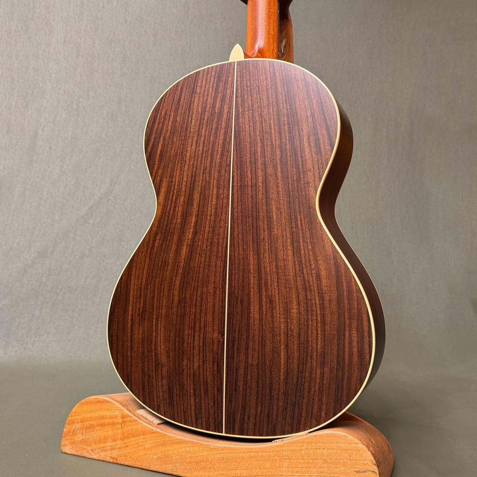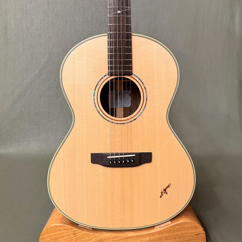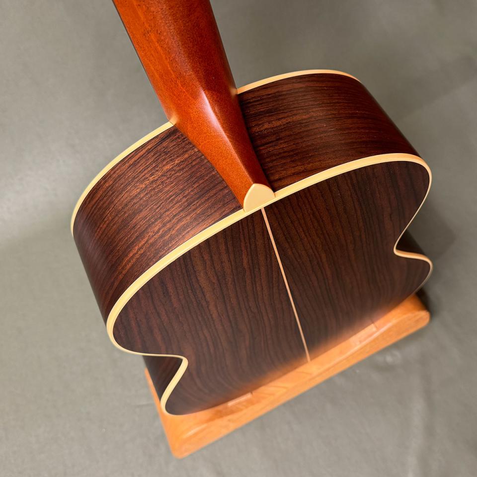 本器は当店からの特注仕様で、ナチュラルが生える美しいシトカスプルースを、半つや出し仕上げにして頂いた1本です。スプルース・インドローズの全面単板であり、純国産ヤイリギターの職人の手によってハンドメイドで組上げられる、ヤイリギターの中でも特に人気のモデルです。ヤイリギターのフラッグシップモデルともいえる本器は、クラシックギターのボディーラインを採用したフォークギターとして80年代からヤイリギター独特のボディータイプとして人気があります。90年代初頭から多くの有名ミュージションが特注することにより、メディアでの露出も増え、同様のモデルを注文する方が絶えません。