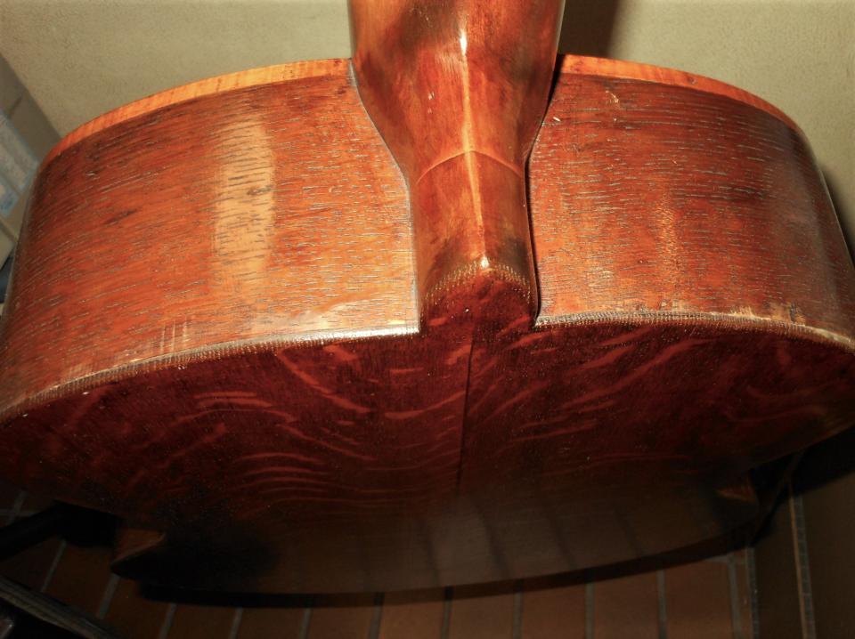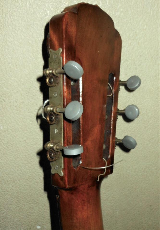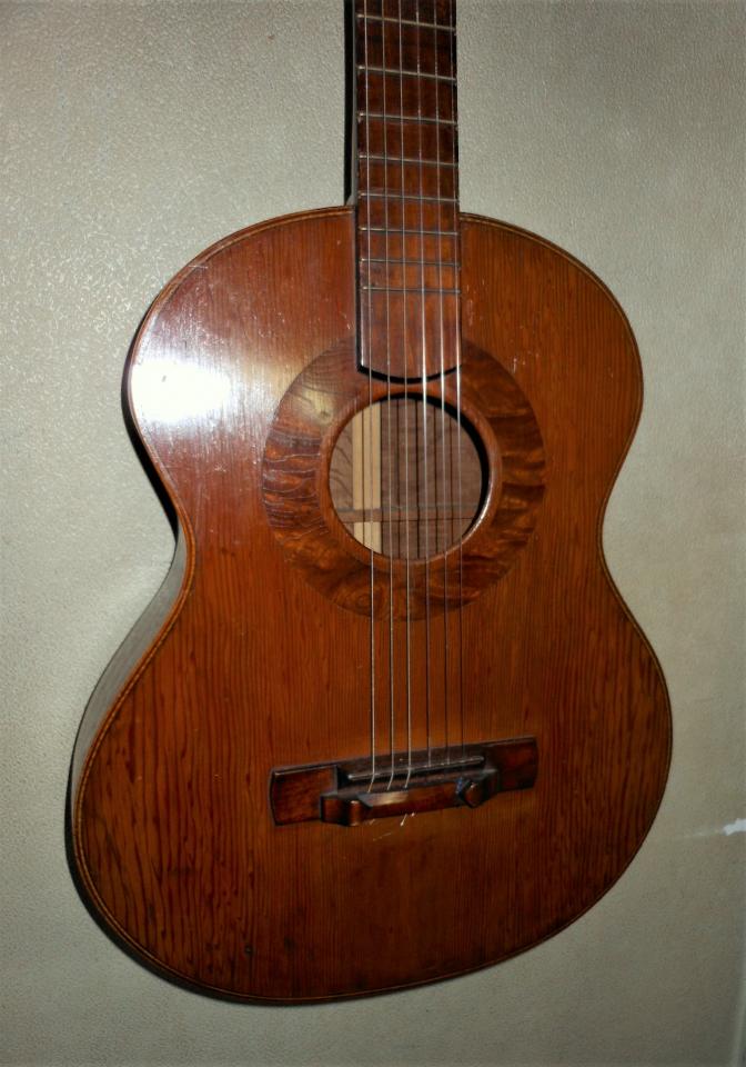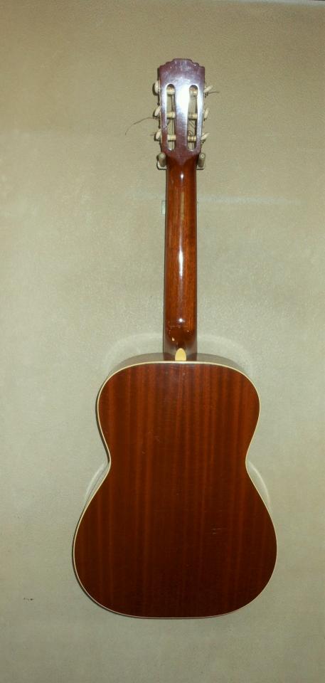 何の情報もありません。手作り感あふれる1本です。一見プロフェッショナルな感じがしませんが、よくよく拝見すると、なかなかの技術を持った方の作品と思われます。極めつけは、トップが水平では無く、ES175のようにブリッジに行くにつれて、後方に(下に)婉曲しています。ゆえにボディーの厚さも、場所によって変化しています。彫刻のようなヘッド、ブリッジ、とても説明出来ない領域の作品です。サウンドは、やさしく、暖かいもので、癒やされます。ハードケース付き。弦高も12フレットで3mm、2mmと、弾きやすく設定されています。それなりの、メンテナンスが必要なギターですが、このままでも十分な存在感があり、使用もできます。これはもう、お宝グッズでしょう!