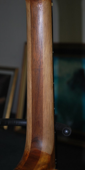 ヘッドのツキ板はバーズアイメイプル、表面板はスプルース指板はエボニー、等々でまったく贅沢なものだが、工作精度は少しラフな作りである。