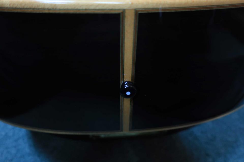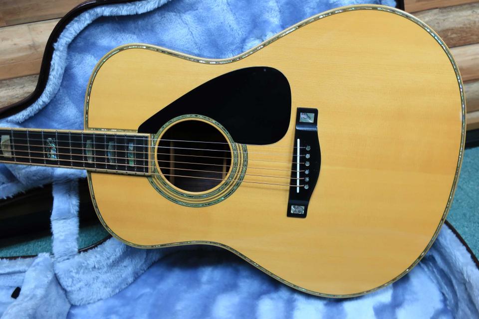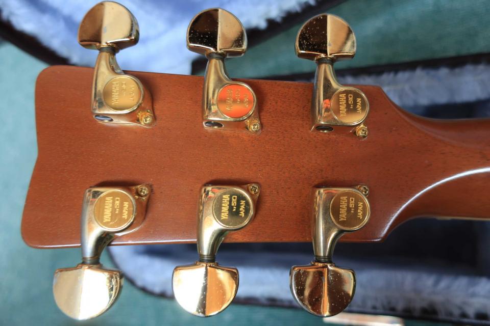 サウンドはタイトでリバーブ感の有る伸びやかな低域に音抜けも素晴らしく輪郭の際立った中域と、軽いストロークも煌びやかで艶やかな『シャリ~ン』と響く倍音豊かで華やかな高音域は魅力で、強めのストロークでもドンシャリの鳴りは健在でトーンバランスに優れたヤマハのカスタム・モデルを代表する鳴りです。ボディ内部のインナー革ラベルには桜井氏のサインが確認できます。