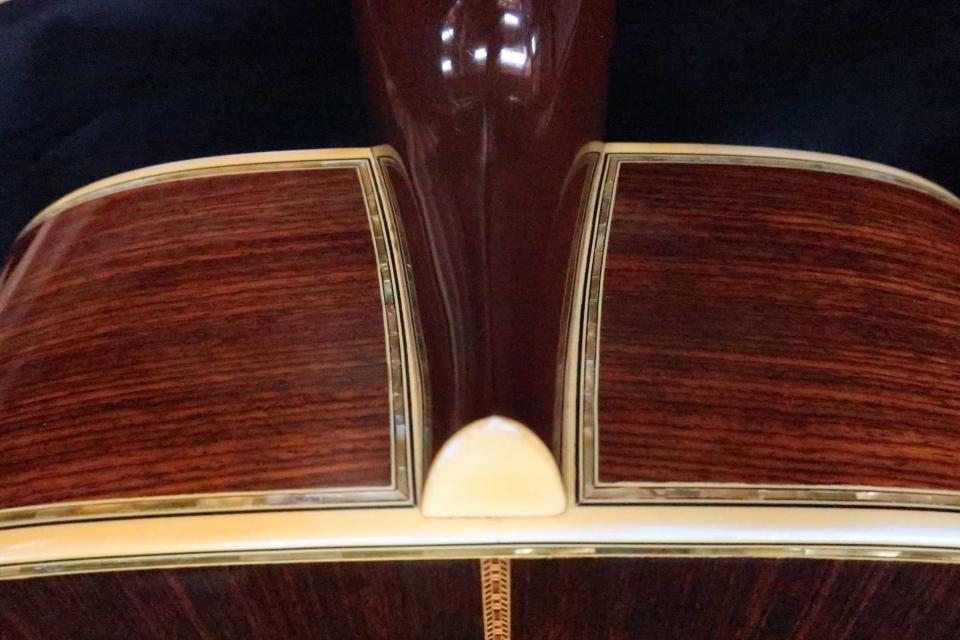 憧れのジャーマントップ期の稀少モデル、Martin D-45の入荷です。1933年~1942年に91本のみ製作され生産はが終了し1968年に再生産が開始され、何時かは『D-45』と多くのギタリスト憧れの最高峰モデルです。本器は157本製作された1974年初頭のモデルで、ヘッドにはオリジナル・グローバー製ゴールドペグ、四十番台の象徴的なバーティカル・ロゴ(縦ロゴ)、指板には豪華なヘキサゴン・インレイ、ネック材は勿論杢目も美しいワンピース・マホガニーネック、、エボニー指板&ブリッジ、トップやバック&サイド、サウンドホール・ロゼッタにも惜しみなくソリッド・アバロン(無垢材)の装飾が施されております。トップは憧れの杢目の詰まったジャーマン・スプルース単板、サイド&バックは杢目の美しい柾目のインディアン・ローズウッド単板で製作された稀少モデルです。