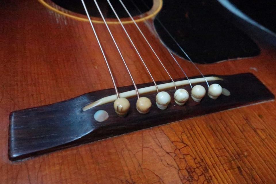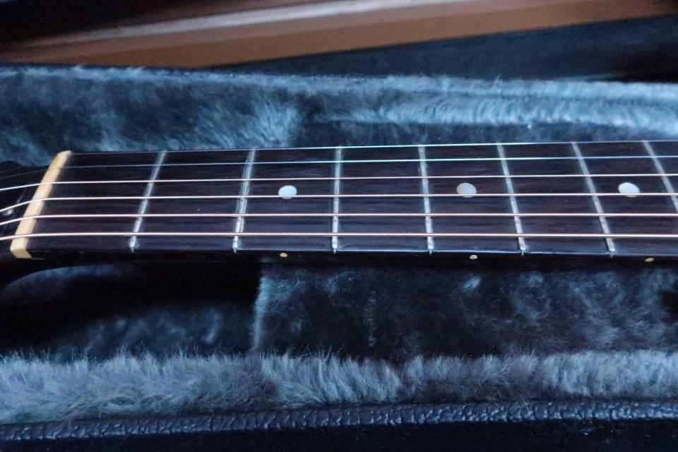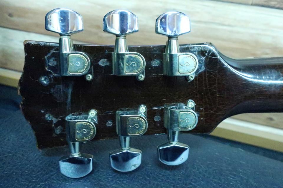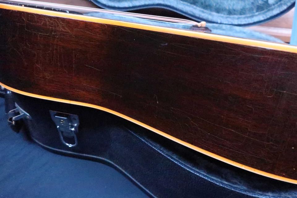 状態は、ご覧の通りゲキ渋のリアル・ヴィンテージに仕上がっており、ペグは交換されネジ穴も処理済みで、シャーラー製クロームペグはとてもスムーズです(オリジナルペグ欠損)。また復刻ペグへの交換でより40年代のルックスが堪能できると思います。ネック裏やボディーには年代相応のウェザーチェッキングが見られヴィンテージ・ライクな激渋のルックスです。トップはピックガードとサウンドホール脇にスクラッチ傷の塗装剥げが有り、6弦側のショルダー付近に擦り傷、ガード上にスクラッチ傷など細かな打痕や擦り傷は見られますが酷く目立つダメージやクラックは見受けられません。サイドにも塗装のチェキングや打痕がボディエンド付近に細かく有りますが年代から考えれば綺麗かと思います。バックもウェザーチェッキングがビッシリと入っており中央左にバックル傷や擦り傷、打痕が見受けられますが年代から考えれば少な目ではないでしょうか?バックの右に長めのチェッキングが有りクラックの予防的にボディ内部からクリーク処理を2箇所見られますが、内部から手で触っても我の感じもなく違和感はありません。またブレイシングの部分的な剥がれの接着歴が見られます。ブリッジピンは2本がオリジナルで4本は年代違いのヴィンテージピンだとおもいます。フレットは6分目ぐらいは残っている感じです。全体的にペグ交換を除けば大切に弾き継がれてきた個体だと思います。ナット幅実測約45mm、弦高はシクネスゲージで12F6弦で約2.8mm、1弦約2mm、サドルの余裕は約2mm、トラスロッドの余裕も有り調整も可能でネックの元起なども問題なくネックを含めプレヤビリティも良好です。汎用のハードケースも付属しています。中古市場でも1940年代は特に価格高騰が続いており玉数も激減しており是非この機会にご検討を頂ければ幸いです。