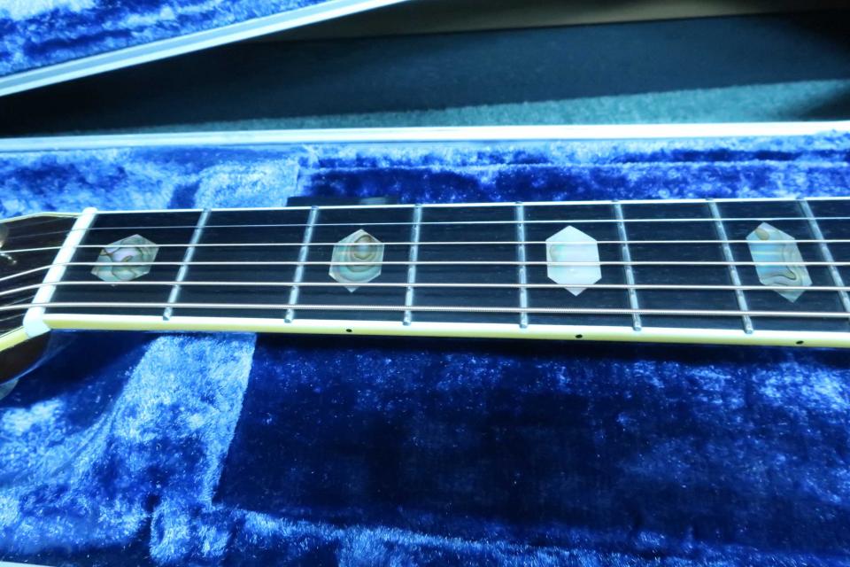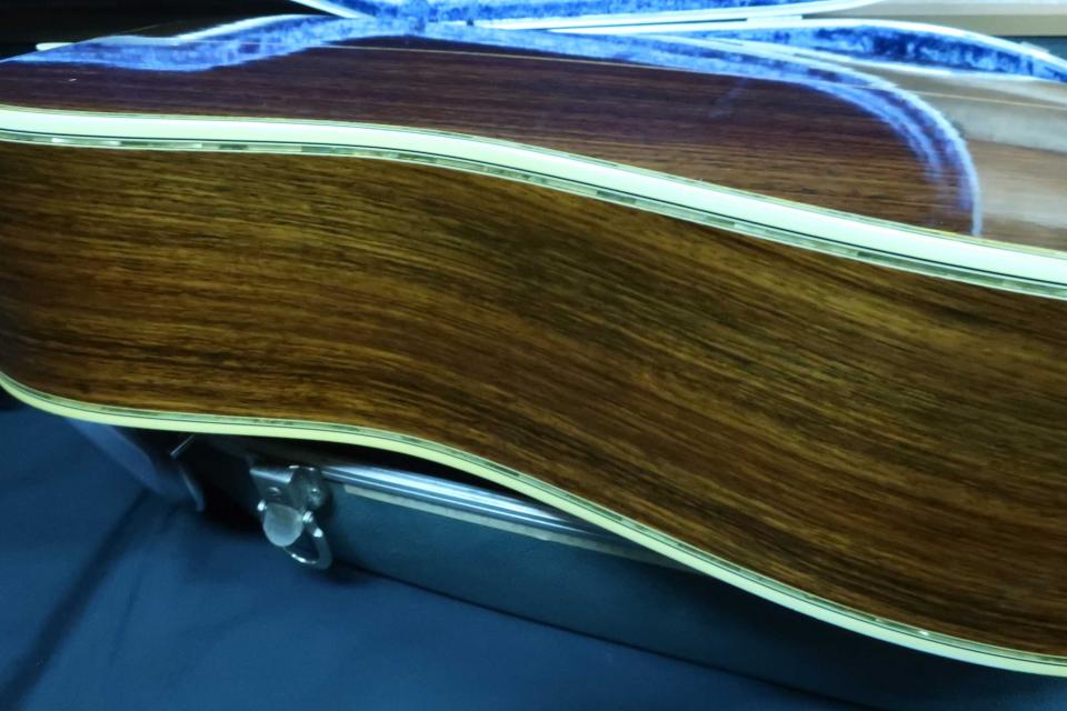サウンドはノンスキャロップドXブレイシング、ローズウッド・ブリッジプレートのスペックで、70年代のフォークシーンを代表する低音は低音らしく重厚で奥行きや深みが有り、中域の粒立ちの良い音抜けに、鈴鳴りと喩えられる倍音豊かな高音域は垂涎のサウンドです。また国内外のトップアーティストやギタリストの愛器として、70年代のフォークシーンで育った叔父さん達(私も含め)の憧れの的でも有りました。カタログや通販雑誌の広告を穴が開くほど眺めながら『どんな音がするのだろう』と妄想しながら過ごした学生時代でした。状態はペグは演奏に伴う金属劣化でメッキの曇りは僅かに有りますが機能的に問題ありません。全体的に使用感は少なめで見る限り木部の修復歴も無くノンクラックでピックガード脇のMartinクラックも無く塗装のチェッキングも見受けられません。ピックガードはオリジナル・ピックガードの張り直しされており光の加減で分かるぐらいで浮きも見受けられません。フレットは交換済みで殆ど減りも無く末永くご使用が可能です。トップには目を凝らして見ないと分からないぐらいの極軽微な打痕が2箇所ぐらいで、サイド&バックやネック裏も素晴らしく綺麗なコンディションを保っておりクローゼット・コンディションと言っても過言ではないコレクタブルな逸品です。またネックヒールのストラップピン打ちやピックアップの取り付け履歴もありません。ナット幅実測約43mm、弦高は12F6弦で約2.8mm、1弦約2mm、サドルの余裕も約3mm有りネックの元起や反り見られずネックを含めプレヤビリティも良好です。綺麗なオリジナルブルーケースに、オリジナル・オーナーズ・カード、ケースキーX2本と前回ご購入販売店の保証書も付属しております。中古市場でも玉数が少なく此のクラスのコンディションを今後探すのはかなり難しいと思います。、サウンド、コンディション、稀少性を兼ね備えた歴史的にも希少なコレクターズピースです。是非この機会にご検討を頂ければ幸いです。