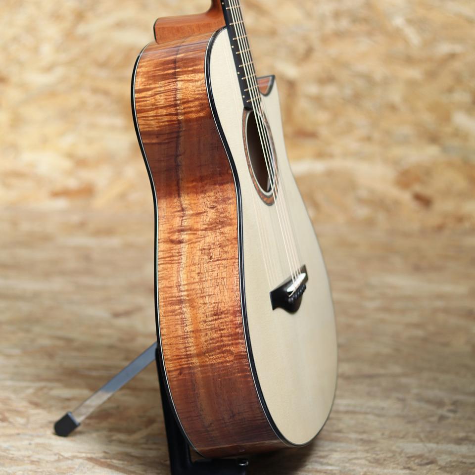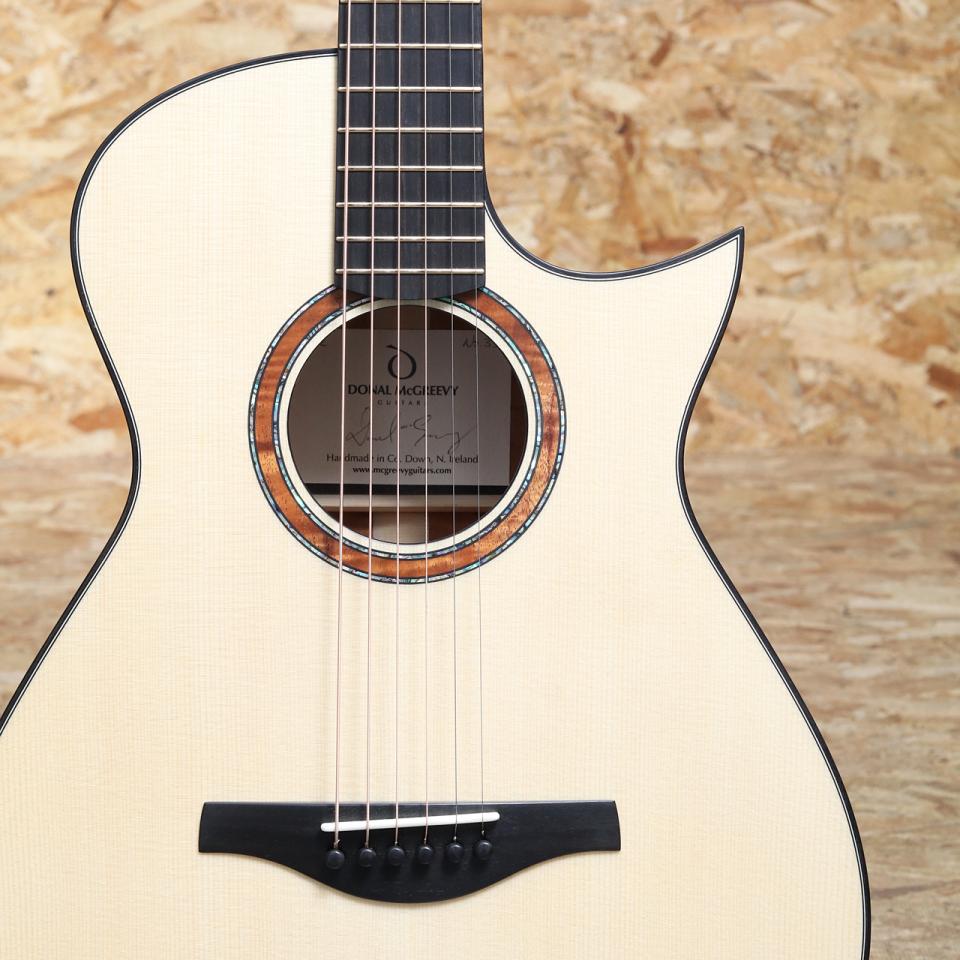 北アイルランドのルシアー”Donal McGreevy”。2011年、北アイルランドの”Lagan Lutherie School”で”Sam Irwin”の専門的な指導のもとギター製作を始め、その後まもなく自宅の小さな工房からスタートした”Donal McGreevy Guitars”。”Sam Irwin”はアイリッシュギターの名工”George Lowden”のもとで長く製作を手掛けていたルシアーであり、リラ(竪琴)の製作家としても有名。そんな師のエッセンスも受け継ぎながら、デザインの美しさ、サウンドのクオリティ、プレイアビリティを追求した独自のスタイルを確立。ルシアーとしての圧倒的なセンスの良さで、メキメキと実力をつけ、人気急上昇中。現在オーダーも数年待ちです。本器は”Woodstock Invitational Luthiers Showcase 2022”へ出展されたShow Model。OO(ダブルオー)サイズ程の大きさの”Model 2”と名付けられたオリジナルシェイプモデル。マスターグレードイタリアンスプルーストップ、フィギャードハワイアンコアサイド&バック、マホガニーネック、エボニー指板&ブリッジ、アレッシ製オープンバックペグ、フィギャードハワイアンコア&グリーンアバロンロゼッタ、エボニーバインディング、フローレンタインカッタウェイ仕様、ボルトオンネックジョイント、セミグロスフィニッシュ。振動効率に優れたダブルサイド構造を採用することでトップ、バックの響きがスムーズに伝達し、ボリューム、レスポンスに優れたサウンドを生み出します。やや広めの46mm幅ネックと短い635mmスケール、そして13フレットジョイントネックにより、驚くほど快適な演奏が可能となっており、初めて手に持つ瞬間から手に馴染む感覚を得られます。豊かな倍音と繊細なトーンバランスで特にフィンガースタイルとの相性は抜群。より現代的なルックスとフィーリングを持つ”Donal McGreevy Guitars”の”Model 2”。ギターづくりにおいて彼が求める「シンプルでありながらエレガントであること。」まさにこれを具現化した作品。今大注目を集める人気ルシアーの最新作を是非ご堪能ください。Hiscox製ケース付属。