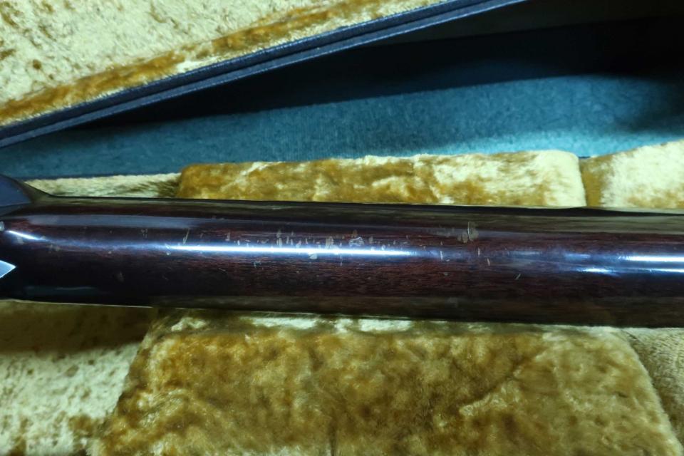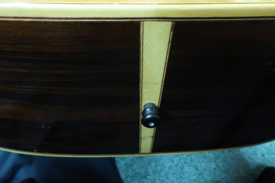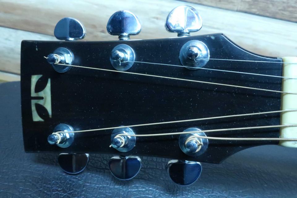 状態はペグの金属劣化やメッキの曇りも見受けられず輝いており機能的にも問題ありません。トップの右下端辺りにポツ打痕が少しと僅かにスクラッチ傷が見られますが使用感は少なめで、ボディ左のショルダー辺りの模様はキズではなく木目になります。その他は右サイドの下辺りに擦り傷と打痕が少々と左サイドにも少し見られますが酷いダメージでは有りません。バックは擦り傷が点在しておりますが割れなどの修復歴などは見受けられません。ネック裏3フレット裏から5フレット辺りに打痕と10フレット裏にも少し打痕が見られます。物凄く演奏で気になるダメージでは無いと思います。またネックヒールのストラップピン打ちやピックアップの取付履歴も有りません。ナット幅約43mm、弦長約641mmで、弦高は12F6弦約2.5mm、1弦約2mm、サドルの余裕が約3mm程度でネックを含めプレヤビリティは良好です。 タカベ製オリジナルハードケース付です。中古市場でも滅多に出ないTGシリーズの最高峰モデルです。。是非この機会にご検討を頂ければ幸いです。お探しの方も多いと思いますのでお早めにゲットして下さい!