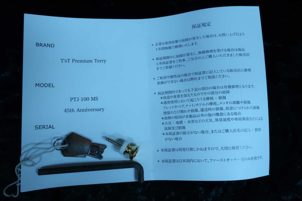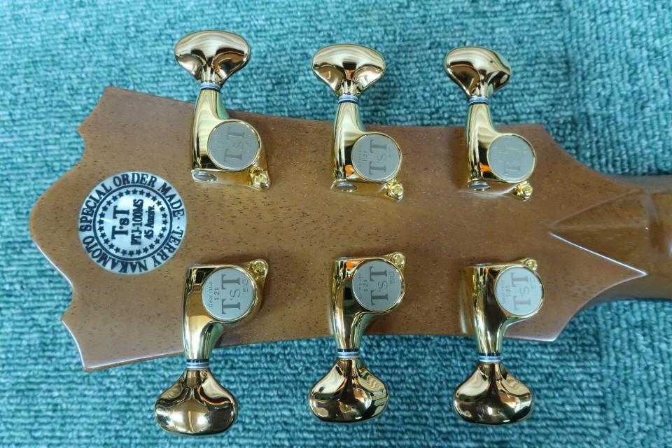 さだまさし氏デビュー45周年を記念して製作された希少モデル、 Terry's Terry Premium Terry PTJ-100 MS 45th Anniversary “Sakura”の入荷です!本器は45周年を記念して45本限定生産され2018年11月の発売で即完売をした逸品です。ヘッドには”T’sT”のインレイロゴ、絢爛豪華な”Sakura”インレイがヘッドから指板エンドまで豪華に施され記念モデルに相応しい芸術性の高い存在感の有る仕上がりです!ヘッドにはオリジナル・ゴトー製510ゴールド・ペグ、トップはシトカア・スプルース単板、サイド&バックにはインディアン・ローズウッド単板、エボニー指板&ブリッジ、べっ甲柄ピックガード、マホガニー1ピースネック、ローズウッド・バインディングがラウンド・ショルダーのボディラインを際立たせた逸品です。またボディ内部のインナーラベルには、”テリー中本氏”と”さだまさし氏”の直筆サインが有りダブルネームの希少性も兼ね備えたアニバーサリー・モデルです。サウンドは”さだまさし氏ご本人使用実機と同仕様でのリリース”で、ご本人のツアーでも使用されており、ファン垂涎のサウンドです。伸びやかでスケール感の有る低域に軽いタッチでも粒立の良い中域の音の立ち上がり素晴らしく。強めのストロークでも1音1音の音が潰れず輪郭の際立った箱鳴りする音抜けとリバーブ感は流石です!またフィンガーピッキングでは弾き手のピッキング・ニュアンスが絶妙に表現され煌びやかで澄んだ透明感の有る高音域も魅力です。状態はコレクションとしてご購入されており、ペグの金属劣化やピックガードのスクラッチ傷も見受けられず新品同様のコンディションを保ったコレクタブルな極上品です。またヒールのストラップピン打ちやピックアップの取付も有りません。弦高も新品時の12F6弦で約2.7mm、1弦約2.1mmサドルの余裕も約5mmありネックを含めプレイヤビリティも良好です。オリジナルハードケース、保証書、レンチも付属したお勧め品です!発売予約で即完売した人気のコレクターズピースです。買い逃しした方は是非この機会にコンプリートして下さい。