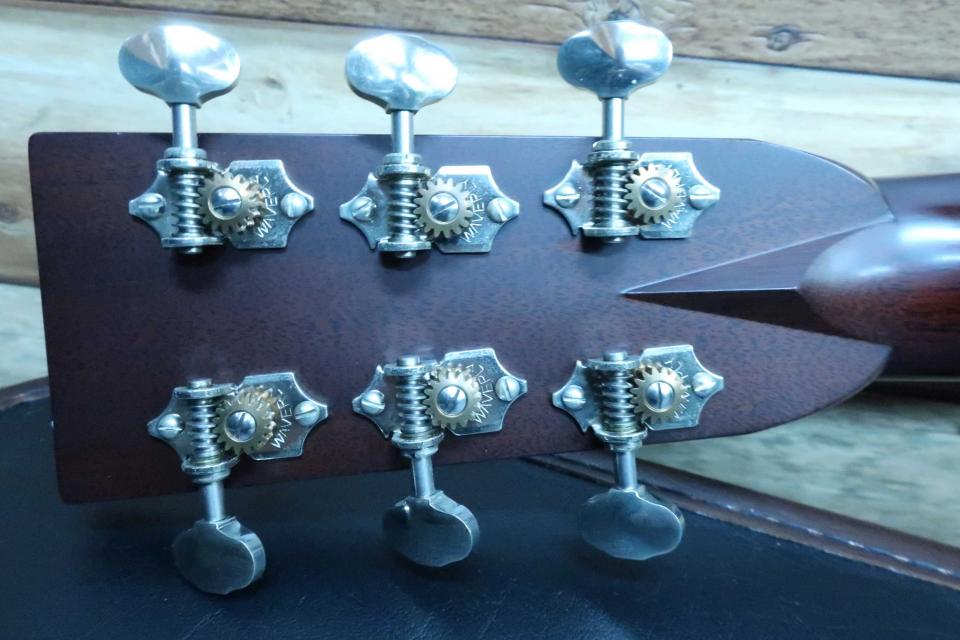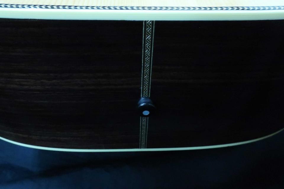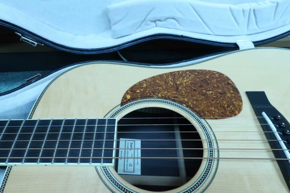 本器はトニーライス自身が所有する 『1935年製 D-28』がベースに製作された傑作。トップのアディロンダックス・スプルースに製作段階で1940年代の純正Martinピックガードを装備した逸品中の逸品