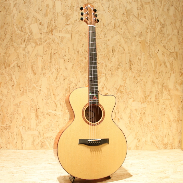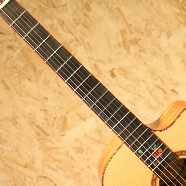 岸部眞明、押尾コータロー、チョン・スンハなどと共に、フィンガースタイル・ギター市場の発展に貢献し続けてきたプロのフィンガースタイル・プレイヤー”フアン・チア・ウェイ”。彼の理想とする『リーズナブルでプレイヤーがいつも最高のパフォーマンスを発揮できるクオリティと美しい音色を備えたギター』をつくるため、”品質と演奏性・音色の良し悪しを判断できるトップ・プレイヤー”、”高い品質のギターを製作する手工ブランドの製作家”、そして”彼らの高い要求を形にできる生産工場”と協力し、『Naga Guitars』を設立。現在Nagaの信念は高く評価され、今も多くのプレイヤーに支持されています。本器は日本が世界に誇るフィンガースタイル・プレイヤー”岸部眞明”氏と、世界有数のギター製作家”増田明夫”氏(Water Road Guitar)が監修するHANA SERIES。岸部氏の高い要求を増田氏が『Naga Guitars』の為に、一から設計・デザインし現地にて製品チェックから検品まで行った特別なシリーズです。オリジナルのスモールジャンボボディ、シトカスプルーストップ、マホガニーサイド&バック、マホガニーネック、エボニー指板&ブリッジ、スキャロップドナット、WaterRoadデザインドXXブレーシング、カッタウェイ仕様。岸部氏がメインで使用している"Water Road Guitar"。個人製作ブランド故の製作本数の少なさや価格の高さから、憧れながらも手に取ることが難しいブランドの一つです。その製作を行う増田氏の設計やデザインをメーカー製として落とし込み、比較的リーズナブルな価格で本シリーズは製作されています。シリーズ名にもなっている「花」は岸部氏を代表する曲名を基としています。オリジナルの指板インレイ、HANA Inlayは桜からインスピレーションを得た独創的なデザイン。高級感を感じられる華やかな印象のルックスです。サウンドホールロゼッタにはアバロンが使用されており高級感が際立ちます。ネック自体やや薄めに成形されており、細やかなフレーズでの演奏をサポート。ソロギターを演奏する際に滑らかな運指をすることが出来ます。ジャンボボディを若干小ぶりなサイズにし、バランスや立ち上がりを整えたスモールジャンボボディシェイプ。低音成分が出やすく音が広がりやすいのが特徴です。内部構造のXXブレーシングは増田氏監修の設計。トップ面の強度を上げ、音のバランスや音の立ち上がり速度を向上させるとともに繊細なトーンを作りだしています。その特性から深く響きながら前に出すぎない低音成分、華やかで繊細な高音成分、粒立ちの良い芯のある実音成分とが合わさって出てきます。倍音も多く含まれており、音に包まれながら心地よく演奏が出来ます。やはり拘りの詰まっているところからソロギターで活躍、演奏したい1本。岸部氏の曲を演奏したくなります。弾いた際の響き方も含め一級手工ギターの感覚やエッセンスを随所に感じさせてくれます。ソロギター界の重鎮とタッグを組むルシアーのこだわりを詰め込まれた1本。そのクオリティの高さを是非ご体感下さい。岸部氏のサインがプリントされたオリジナルのハードケースが付属します。
