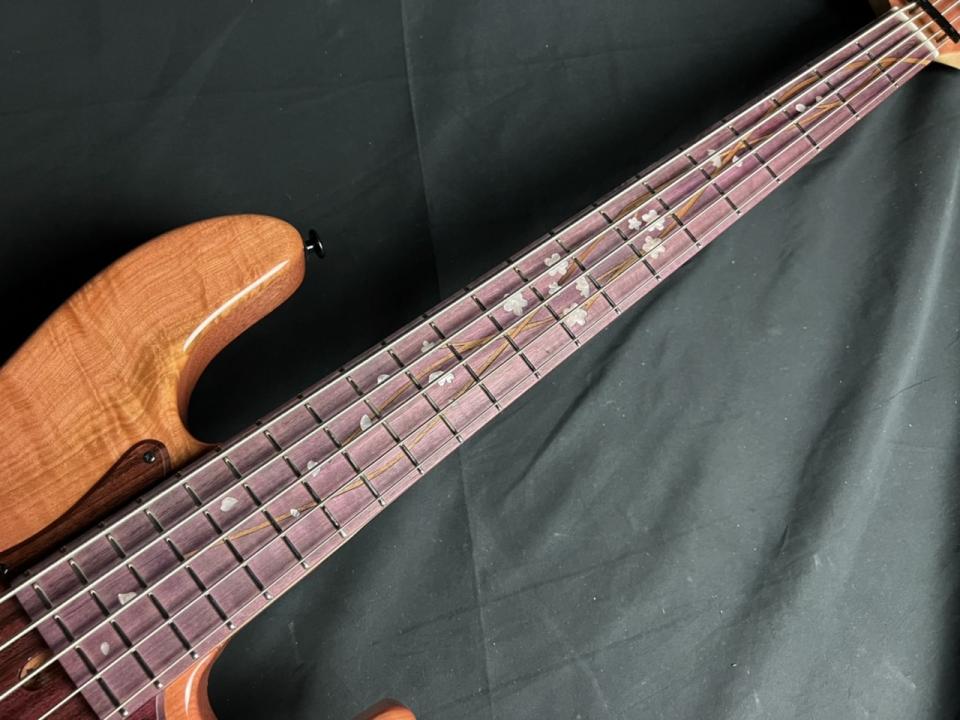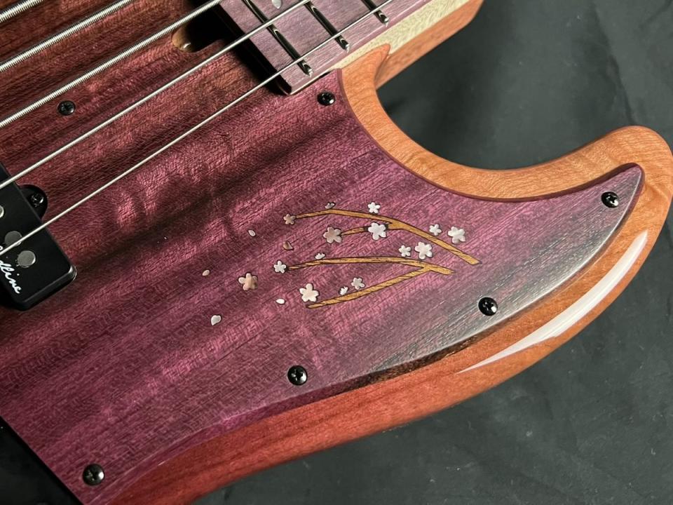 過去の商談会で発表後、国内外で人気を博した桜モデルのWOODLINEが装いを新たについに復刻!商談会の目玉のひとつ、静岡県富士市産の枝垂(しだれ)桜をトップ材に使用しました。パープルを基調に、夜桜を思わせるカラーで調色された鮮やかなグラデーションが印象的です。