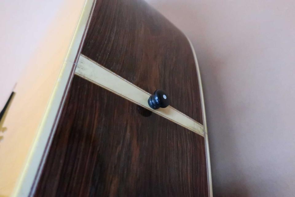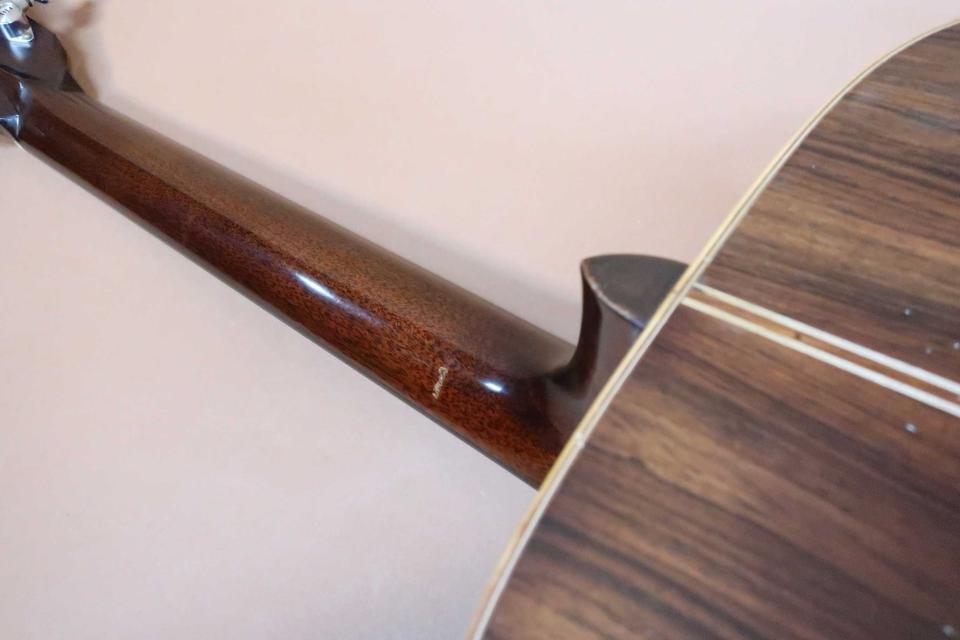 状態は使用感も少なく、ペグの金属劣化やメッキの曇りも見受けられず輝いており機能的にも問題ありません。トップは光に翳して分かるぐらいの塗装上の軽微な打痕や擦り傷ぐらいは見受けられますが年代を考えれば素晴らしく綺麗な状態を保っており、サイド&バックに僅かに白濁の白い筋が見られますが画像ほど現品では気にならない程度だと思います。バックも軽微な擦り傷ぐらいで白濁も有りません(バックの白っぽい感じはうつりこみです)。ネック裏のヒール上部のサイドに擦り傷がありますが綺麗にタッチアップ処理があれ触っても違和感はありません。見る限り木部の割れや修復歴も見受けられず、年代を考えれば素晴らしく綺麗なコンディションを保ったコレクターズピースです。またネックヒールのピン打ちやピックアップの搭載履歴もありません。