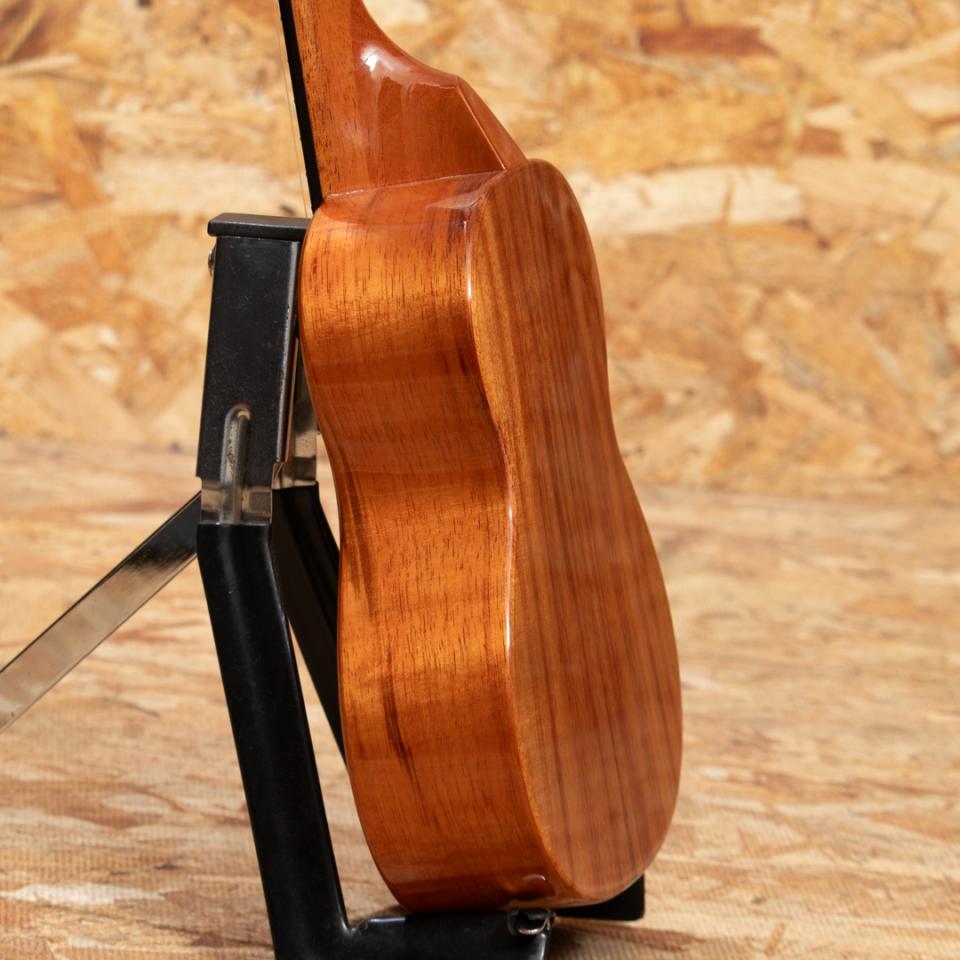 アルヴィン・オカミにより1995年に創設されたコアロハ・ウクレレ。現在は長男で社長のアランと、次男で副社長のポールを中心に全14名の社員で運営されております。今ではハワイを代表するウクレレメーカーの一つとなったコアロハ。モダンなルックスと、明瞭なトーンで響かせる大音量が特徴。独自のブレイシングパターン”ユニブレイス”の採用や、フレットのバリが出ないように設計された指板サイドなど、細かな部分にもこだわりが見られます。本器はソプラノテナーネック仕様という珍しい1本。ジョイントは16フレットと通常より4フレットもヘッド側に出た使用。ハイポジションを多様し中々困難だったような曲やカポタストなどを使用した曲でも違和感なく対応できる通なプロ好みの仕様と言えます。通常のテナーモデルと比べても引き締まったサウンドで、メリハリが利くため、カッティング等、パーカッシブなプレイがよくハマります。テクニカルプレイ好きな方に是非持って頂きたい1本です。