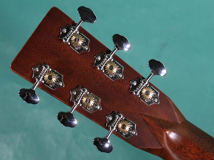OLD-STYLEヘッドロゴ、オープンバックチューナー、指板に5フレット始まりのダイアモンド&スクエアーインレイ、へリングボーンバインディング、べっ甲柄のOMスタイルピックガードと雰囲気タップリのルックスとなっています。