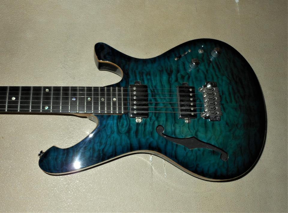 この価格で、このクオリティーを手にできるとは!ヒールレス・ジョイント、バックコンター加工、ロック式ペグにメイプルのボディーバインディング等々、美しいフィガードトップは、深い海のようです。フレットは、あまり弾かれていないかのように綺麗です。もしこの機種が有名ブランドでしたら、50万以上するかのような、雰囲気のギターです!ソフトケース付!フレットもロッドもOKです。光をあてればかなり綺麗なブルーですが、遠目では、ダークです。