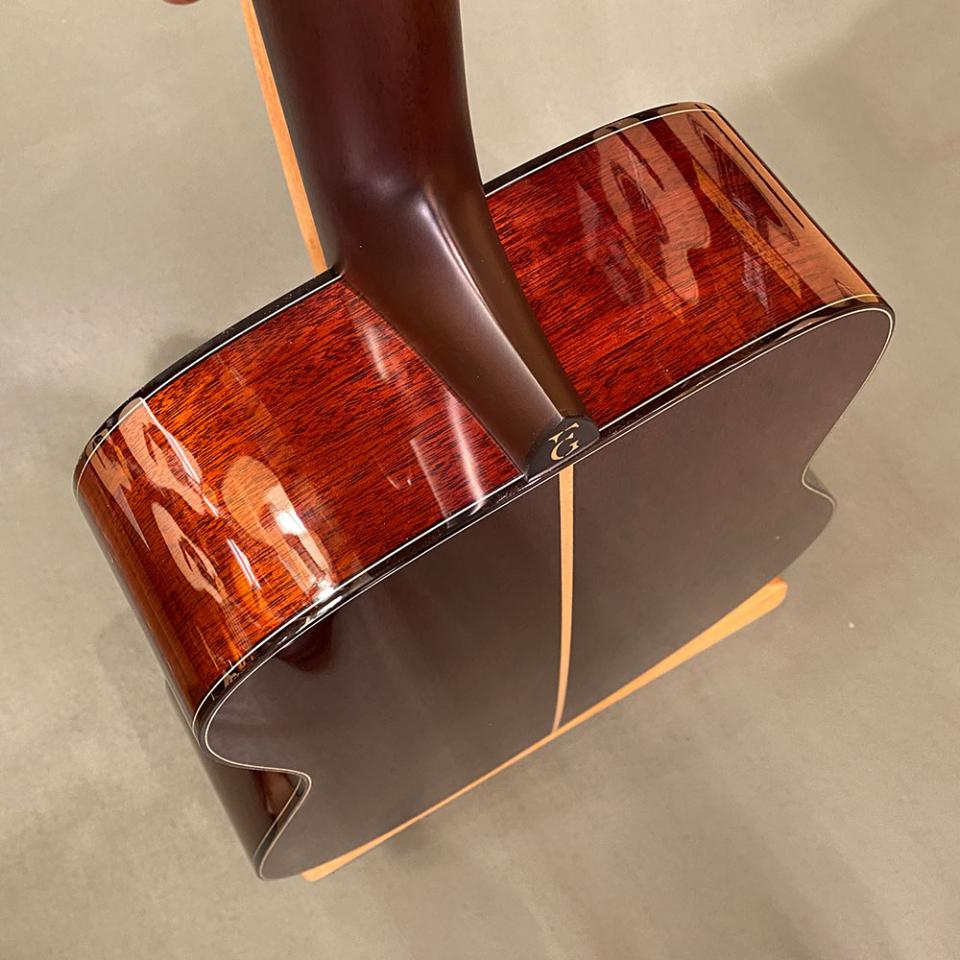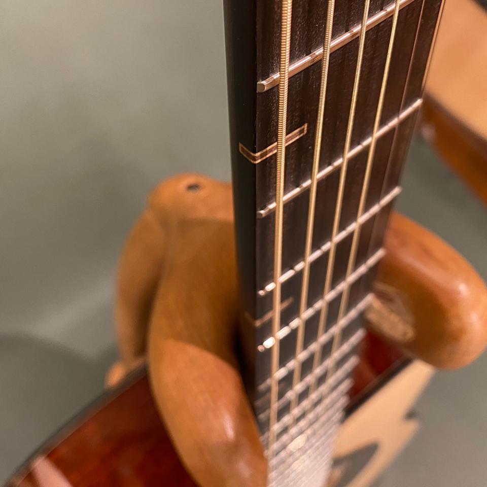 強靭なアディロンダックを使用ということもあり、シトカやイングルマンで製作するよりも板厚を薄めに設計することにより、通常よりもトップの振動を生かしたサウンドとなっているということです。