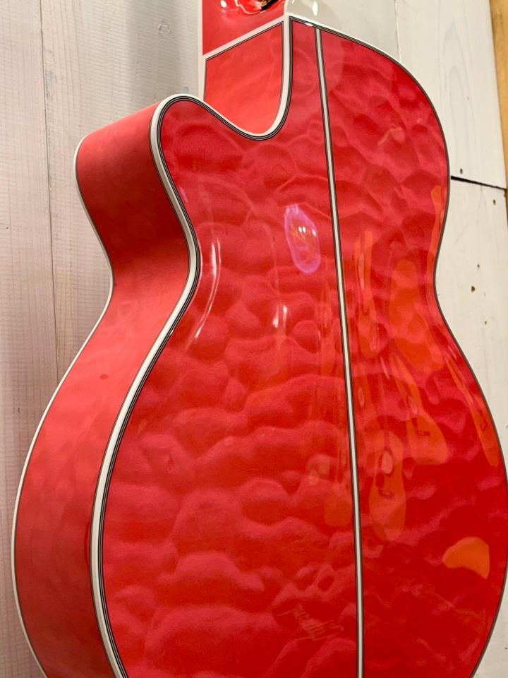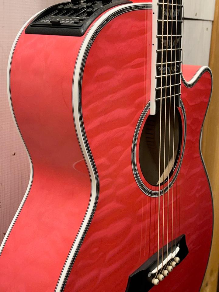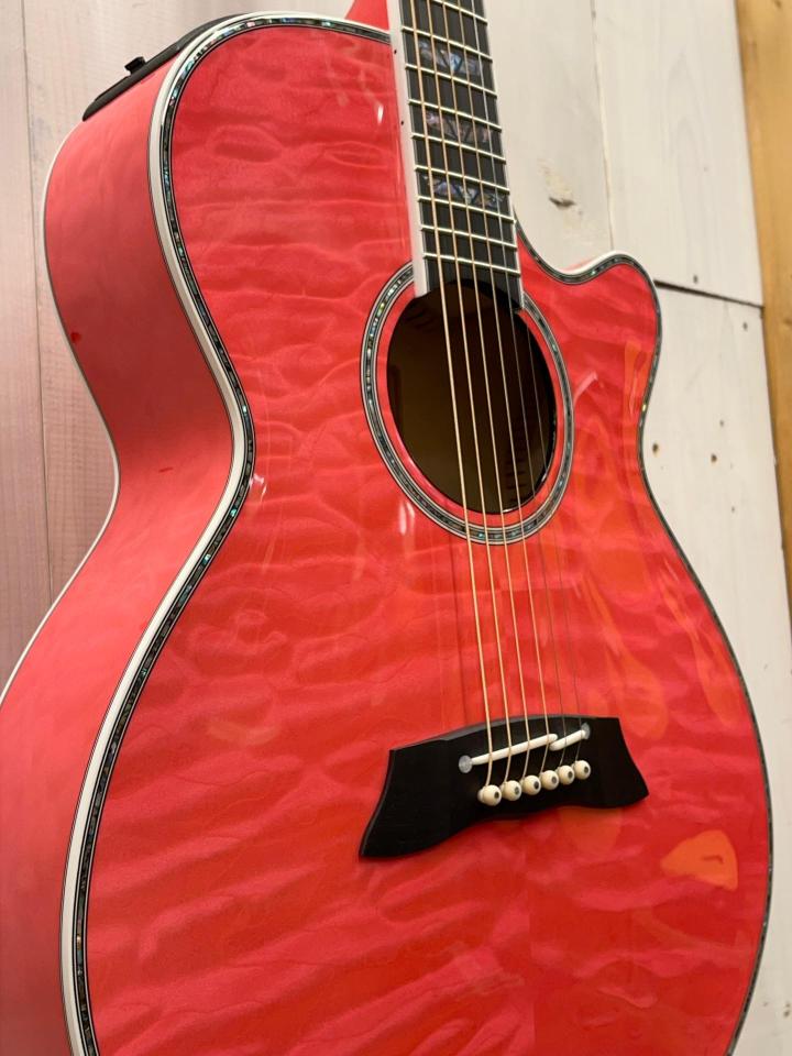立体的な杢目が美しいキルトメイプルを使用したアーチボディに、シースルーピンクカラー!