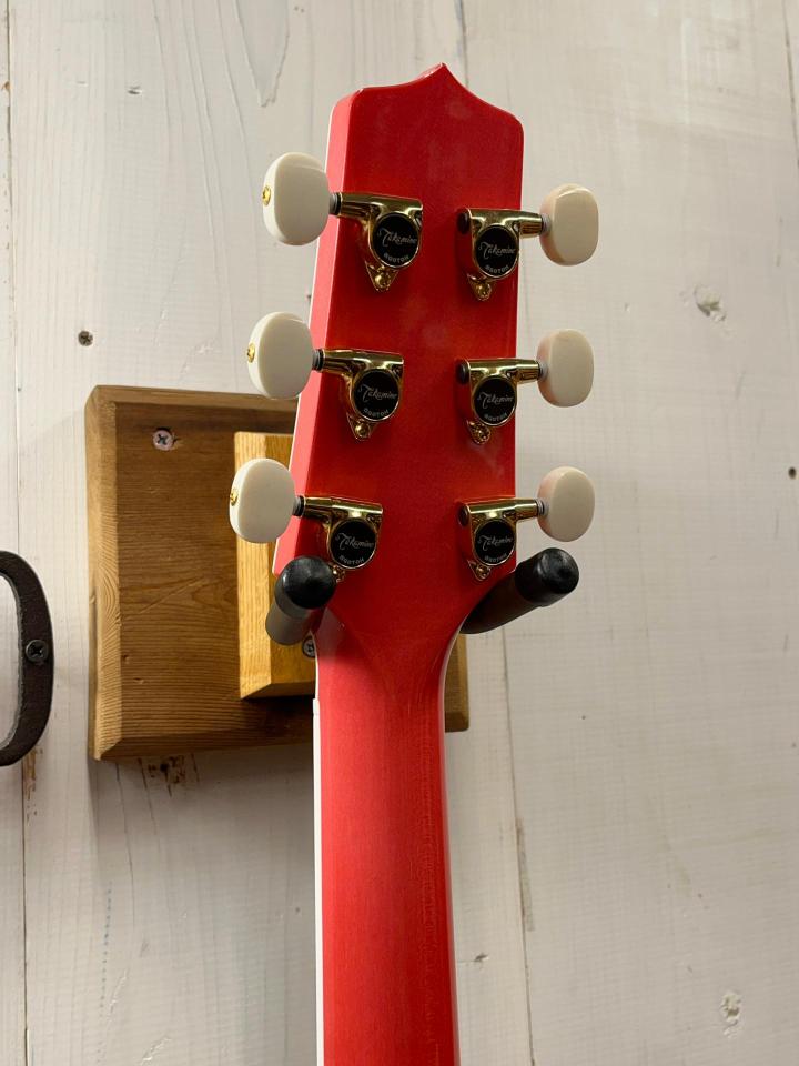 ヘッドの突板も同色でキルトメイプルを使用、ペグにはゴールドパーツ&ボーンボタンを使用し