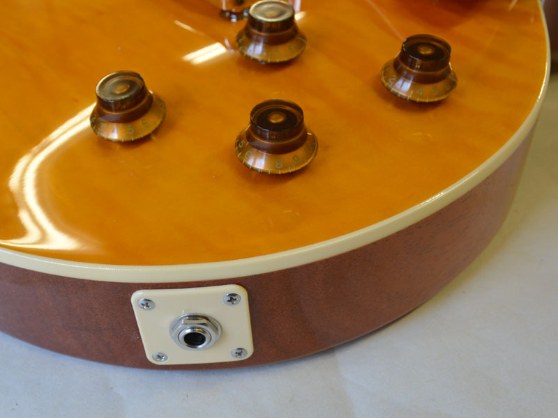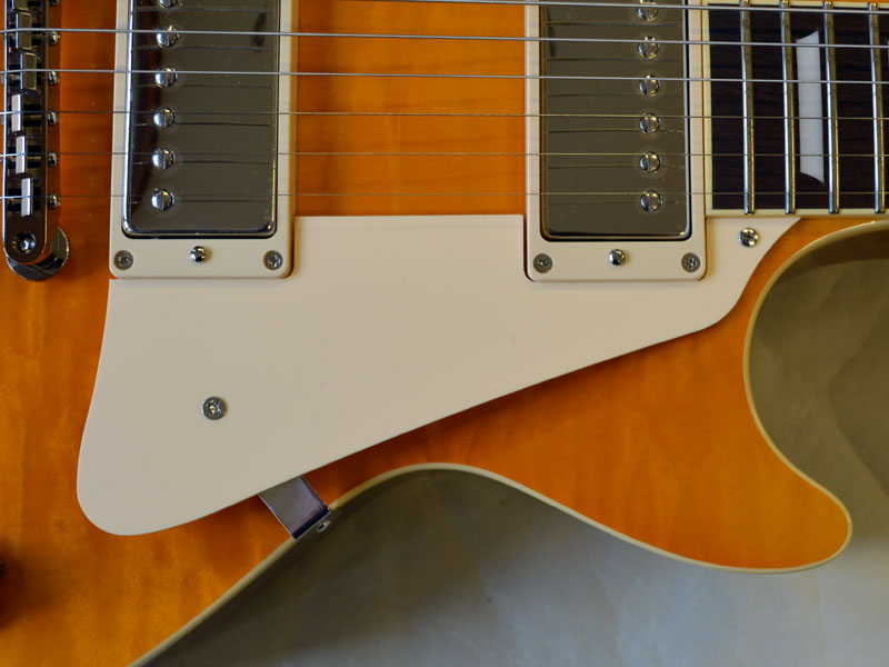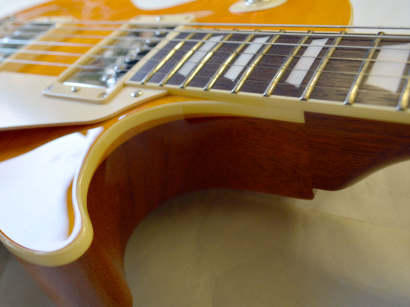 上質な日本製でレスポールスタンダードを忠実に再現し、Flame Maple + Maple Topの二層構造で見事なフレイムメイプルのトップ材に2ピースのマホガニーバック材を採用しています。
