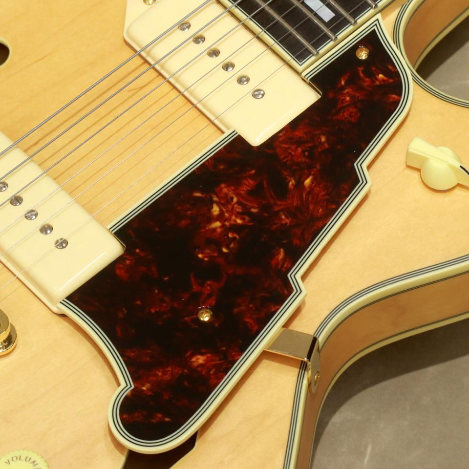 Deluxe 59は、オリジナルの16インチ幅、1.75インチ厚のシングル・カッタウェイ・シェイプのホロー・ボディーのモデルです。ディアンジェリコらしさを感じるオリジナル形状のピックガードは、fホールの一部を思わせるデザインで、5プライのトータス柄となっています。