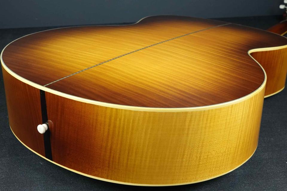 ボディの厚みはジャンボサイズのギターとしては少し薄めに作られており、このサイズとしては音の抜け感、レスポンスの良いサウンドが特徴です。ダイナミックな音像、出音の太さもあり、ラージサイズのボディでもスムーズに響き、太く迫力のあるストレートなサウンドが魅力です。