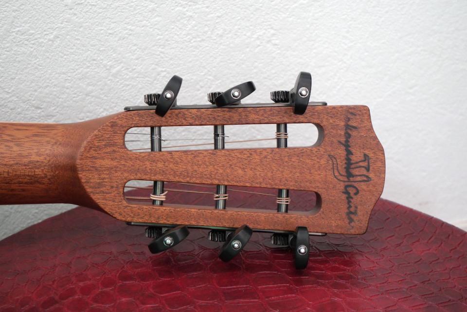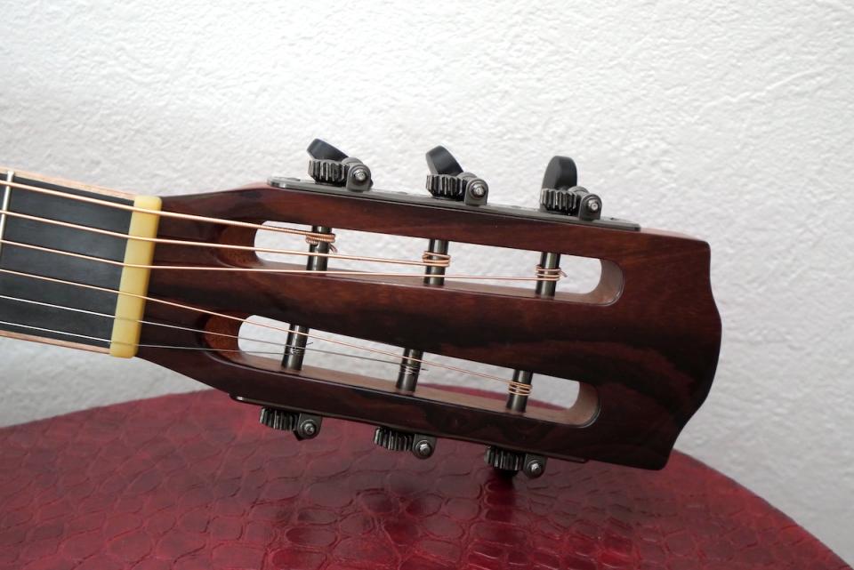 スローテッドヘッドを採用し、ヘッド天神にはカマティロをチョイスしました。ナット幅は44.5mm、スケールは628mmのミディアムスケールとなっています。