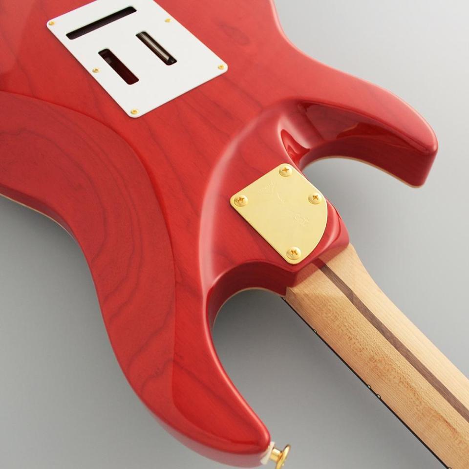 当モデルは、フレイムメイプルトップ・アッシュバックボディ、ローズウッド指板。カラーのRKGは「ライプ・カキ・グラデーション」の略で、熟れた柿をイメージしカラーリングしました。