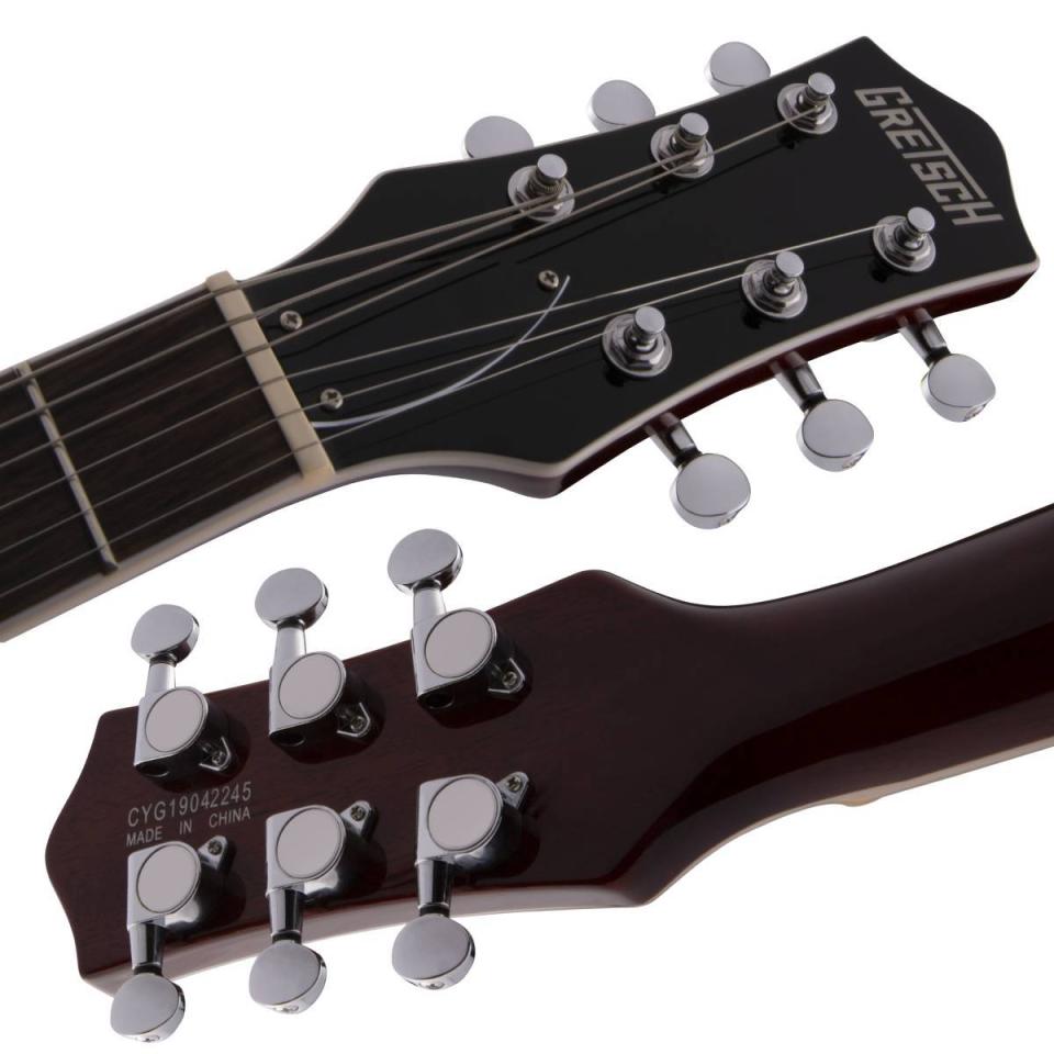 チェンバード構造のマホガニーボディは、Electromatic Jet BTの“心臓”ともいえる重要な部分です。このメイプルトップのマホガニーボディは、リッチで存在感のある中音域を生み出し、より豊な低音域ときらびやかな高音域を強調します。