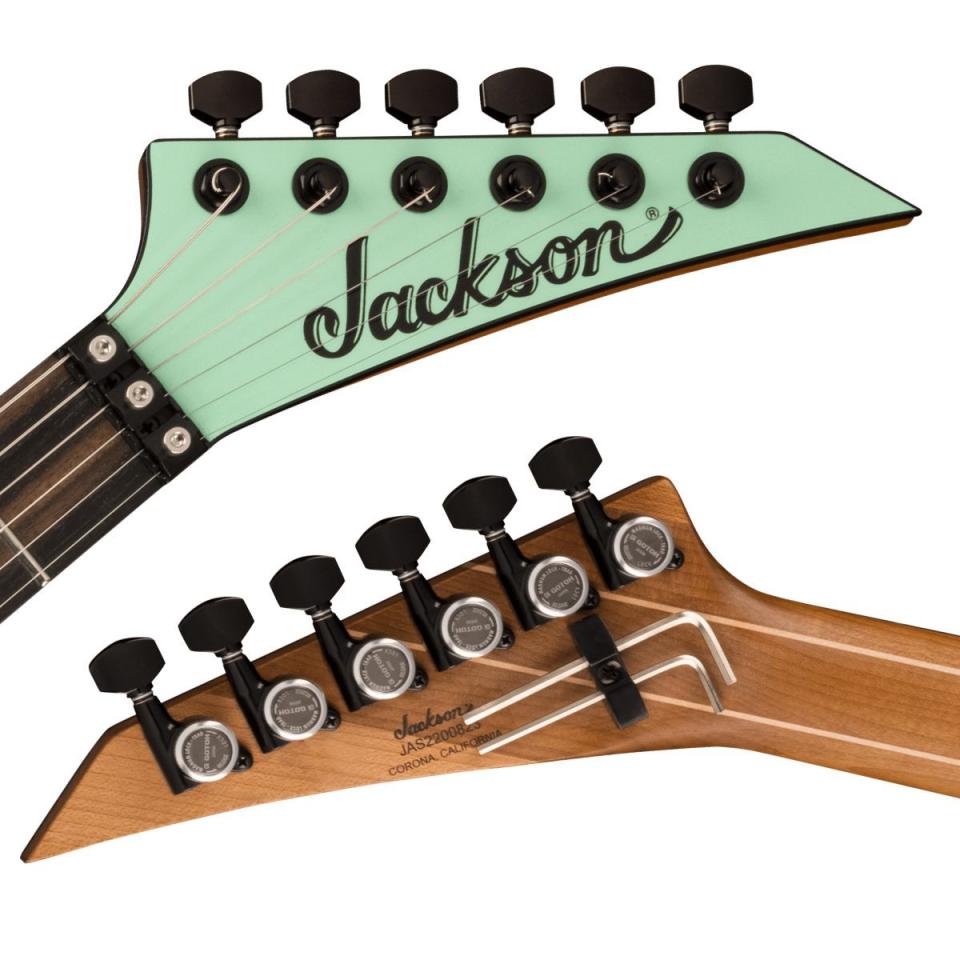 Jackson American Series Virtuosoは、Mystic Blue、Satin Black、Satin Shell Pink、Specific Oceanの4色展開で、マッチングバウンドポインティヘッド、ブラックハードウェアを備えています。