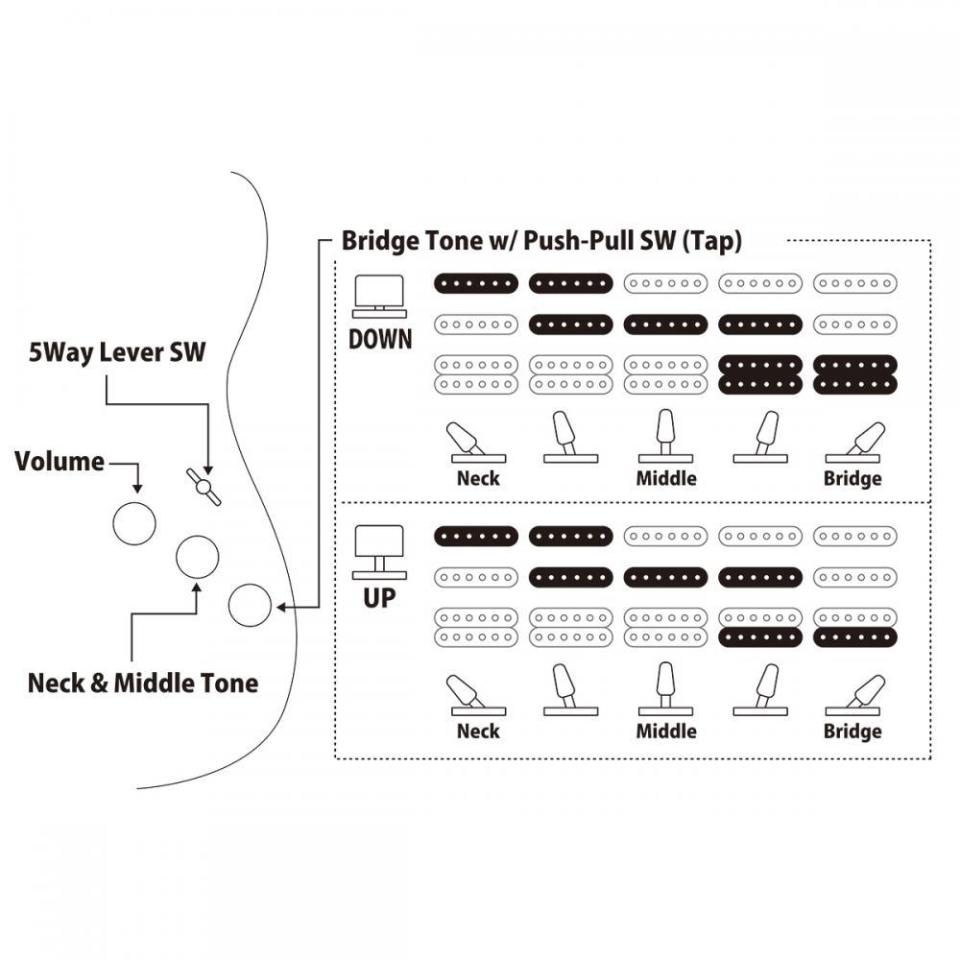 Controls:1Volume, 2Tone (Neck & Middle / Bridge w/ Push-Pull SW for Tap), 5Way Lever SW