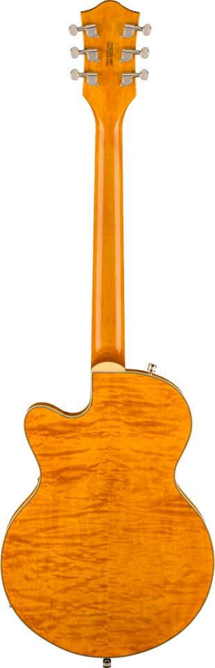 G5655TQM Electromatic Center Block Jr. Single-Cut with Bigsbyは、美しいキルテッドメイプルトップ、バック、サイドを採用したチェンバードスプルースのセンターブロックを備えた小ぶりなボディが特徴で、ダイナミックなレゾナンス、ハイゲインパワー、軽量な快適性を実現しています。