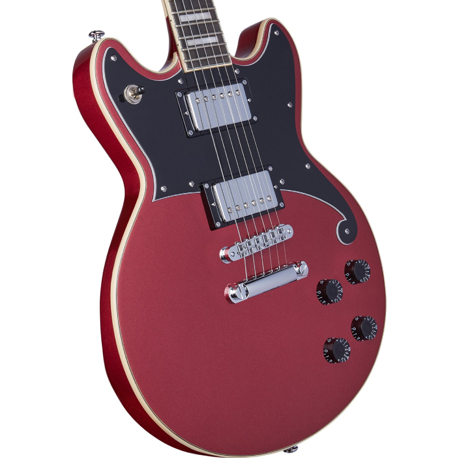 ディアンジェリコらしさを感じるオリジナル形状のピックガードは、fホールの一部を思わせるデザインで、ボディー・カラーに合わせたカラーとなっています。
