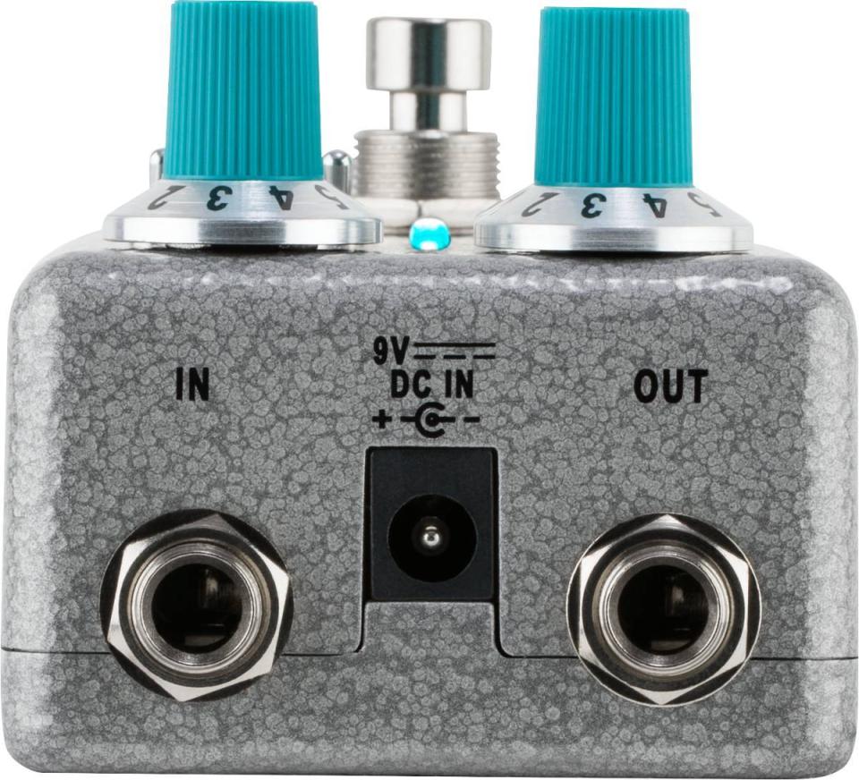 堅牢度の高いシルバーの 4.375” x 2.375” x 1.25”サイズの筐体にはペダルボード上での使用を想定し、インプット/アウトプットのジャックを上部にまとめるという工夫が成されています。
