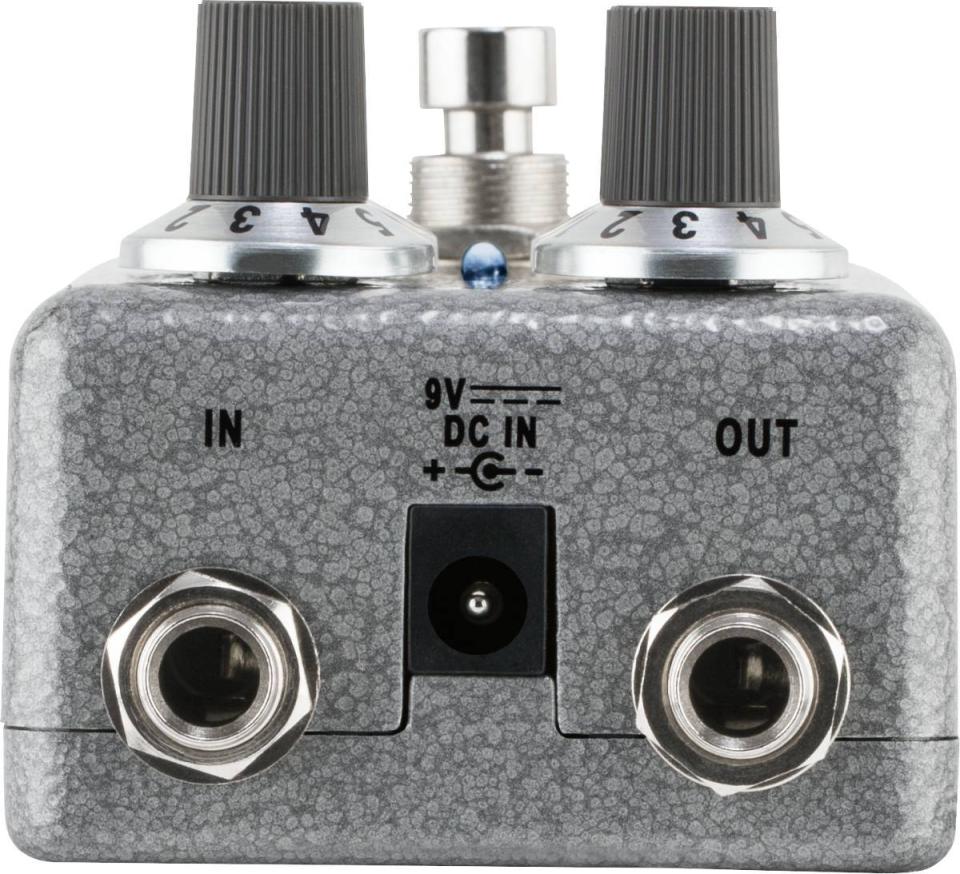 堅牢度の高いシルバーの 4.375” x 2.375” x 1.25”サイズの筐体にはペダルボード上での使用を想定し、インプット/アウトプットのジャックを上部にまとめるという工夫が成されています。