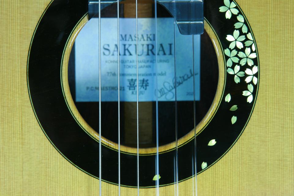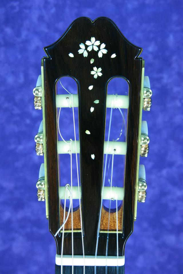 サウンドホールの口輪部とヘッド天神表面とブリッジには、特別デザインの桜の花びらがちりばめられておりまして、優雅で優しい雰囲気が漂っております。