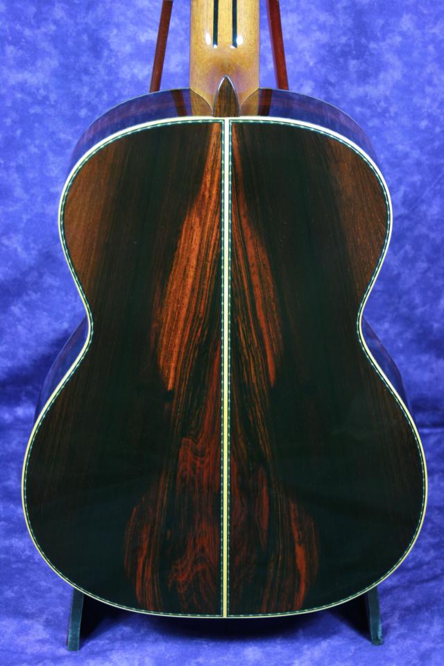 サイド・バックには300年経過の南米ブラジル・ハカランダ地方産の、これ以上の品質はないという素晴らしいハカランダ材を使用しています。