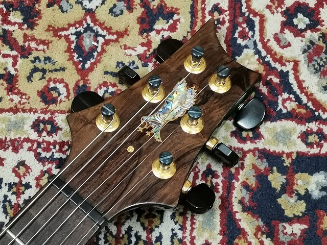 ネックには素晴らしい杢目のカーリーメイプルを、指板には言うまでもなく希少材となっているハカランダ(ブラジリアン・ローズウッド)を採用。