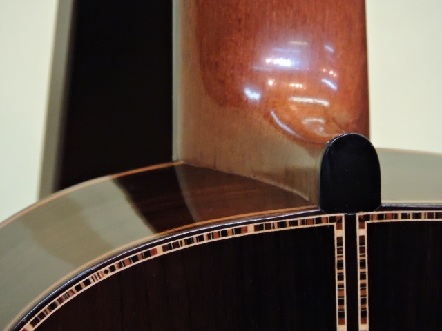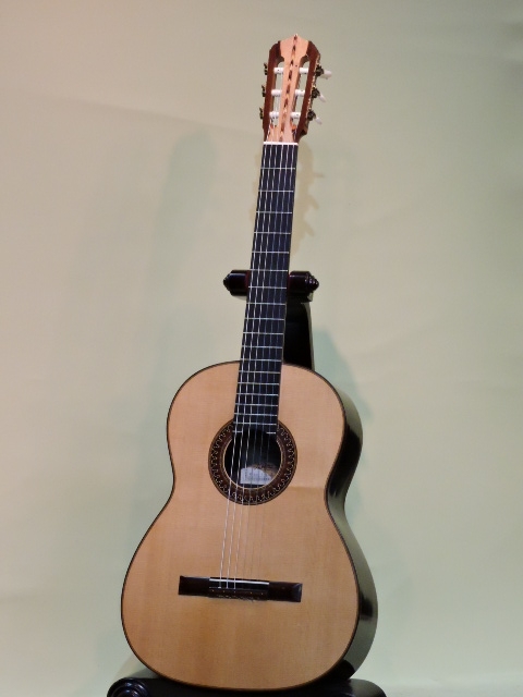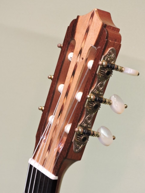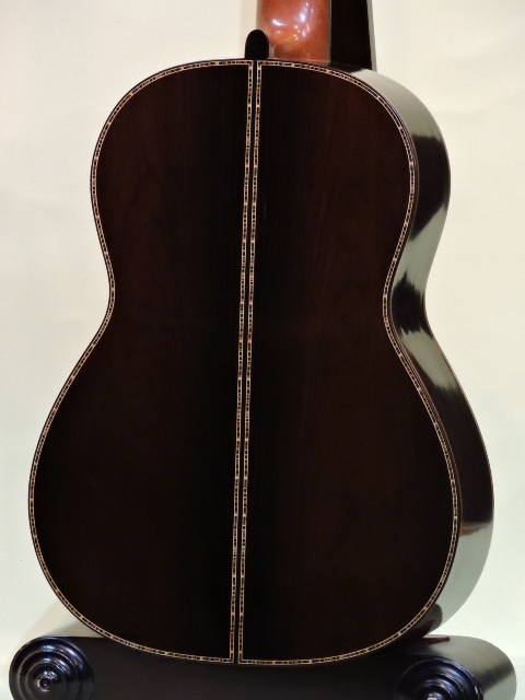このギターの製作年、2002年はまだ1世が元気に仕事をしていた頃で、音は息子との合作というよりは父の作品の特色が勝り、力強い低音と芯の太い甘い高音は親父さんの作そのものでトップクラスの彼の作品と比べても引けを取りません。