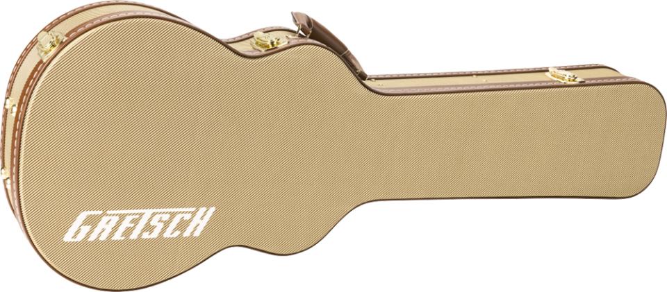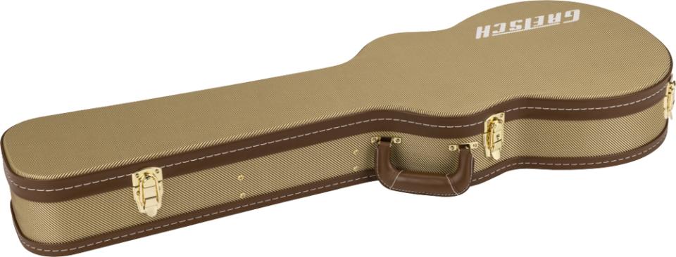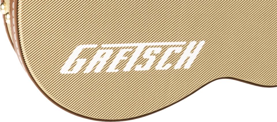 Gretsch Streamlinerの持ち運びに最適なケースです。ツイードの外装に、ゴールドのラッチとハードウェア、ブラウンの豪華な内装、内部の収納スペース、クリーム色のGretschロゴが特徴です。耐久性とスタイルを兼ね備えたケースならどこへでも安心して持ち運べます。
