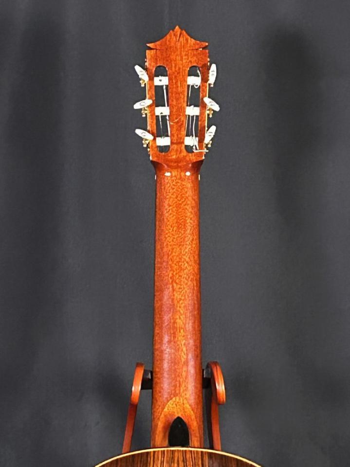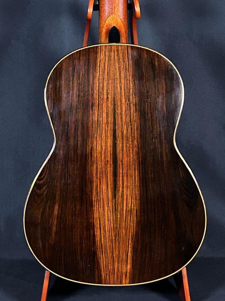 ところどころ、うっすらと斑入りのトップと、バックには特徴的な木目のハカランダ材スペック。