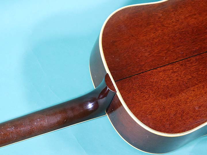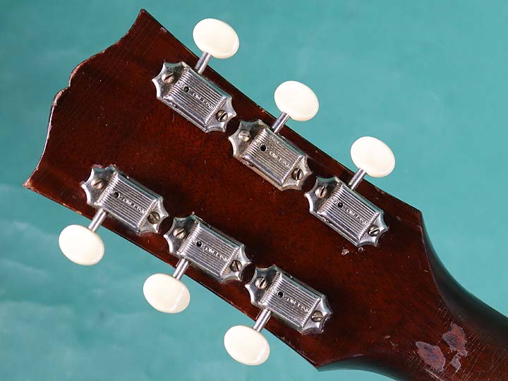 渋く焼けてウェザーチェックがバリバリ入っています。1弦下部にピックキズが目立ちます。バック下部にわずかなヘアラインクラック補修、若干の小キズとかはありますが、塗装の艶も綺麗に残った極上コンディションです。