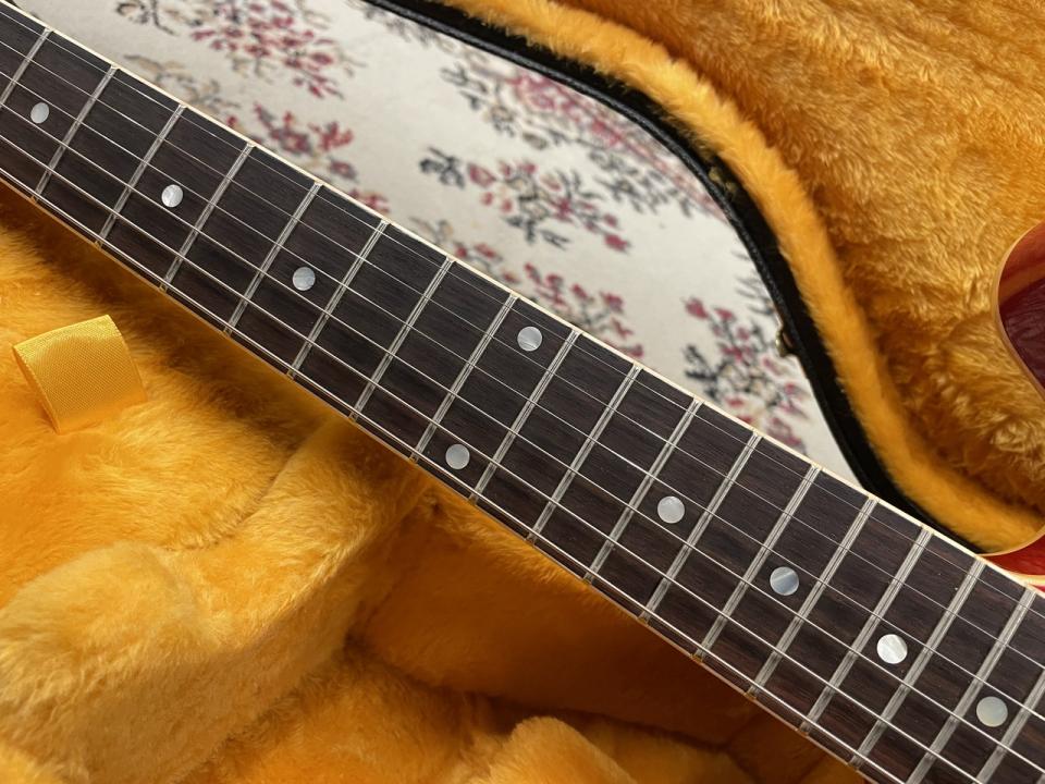 メイプル/ポプラ/メイプルの3プライ・ボディに”ミッキーマウス”ホーン・カッタウェイとスモールFホール、1プライのロイヤルライト・バインディング、オーセンティックなSixties Cherryカラー、ダブルリングのペグ、シルバーインサートのハットノブ、ブラック・ショートピックガード、軽くエイジド加工されたハードウェアが特徴。
