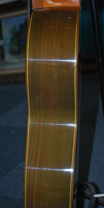 その他では、表面板の1弦側ブリッジ上部に浅くて少し長い(3㎝弱)線条の打痕、側板&裏板にも打痕が散見されるが、割れ補修など重大なものはなく、製作年度を考慮すれば、まずは美品といえる良い状態にある。