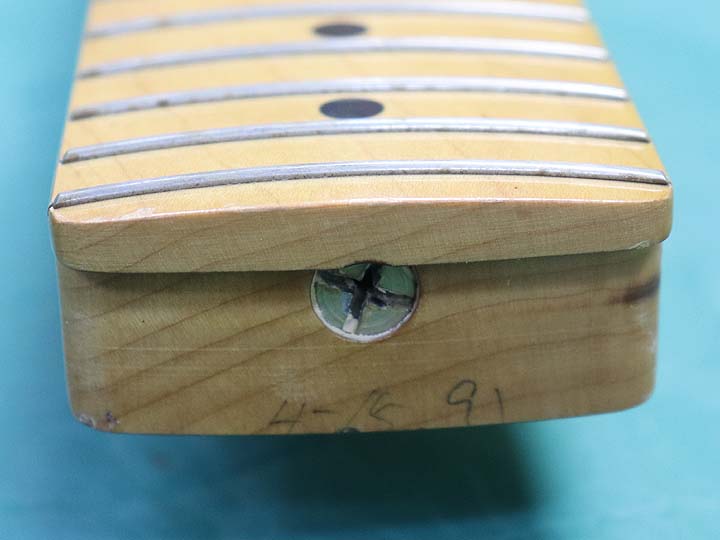 ネックは良好なコンディションが保たれており、トラスロッドは一杯気味ですがまだ少し回ります。フレットに関しては凹みはありますが、十分な高さが残っております。細かな擦り傷や打痕、塗装のチップ等はありますが、年代からすれば綺麗な状態が保たれた楽器です。