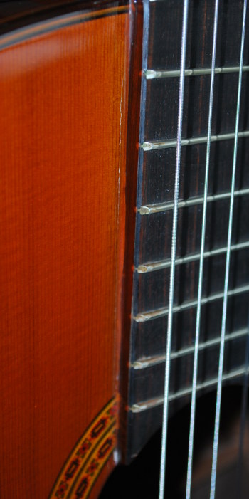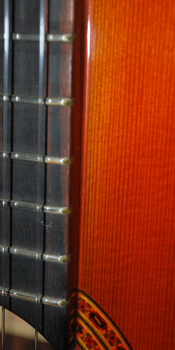 弾き易さについては、スペイン製ギターらしくナット幅が53.5㎜と少し大きいのだが、12フレット上の弦高は6弦側3.3㎜、1弦側2.4㎜、とフラメンコギター並みに低く調整されておりネックの精度が良いので音がビレることもない。