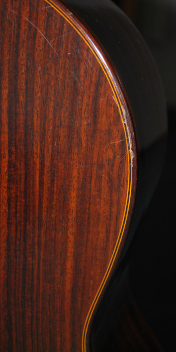 本品の状態としては、年代相応の打痕や擦り傷等の他に、表面板の指板横両サイドとブリッツジの6弦側に塗装のクラック、サウンドホール6弦側にちょうど兎の頭のような形状のウレタン塗膜の色が薄い部分(塗膜の状態からみて製作当初からあるもの)がある。
