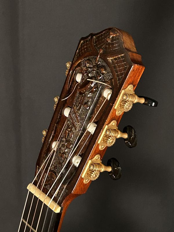 書籍「GUITAR COLLECTION in JAPAN」P.74-P.77で紹介されている実器ですが、この後糸巻きが、恐らく機能面を考慮して近年のものに交換されています。オリジナルは付属しません。