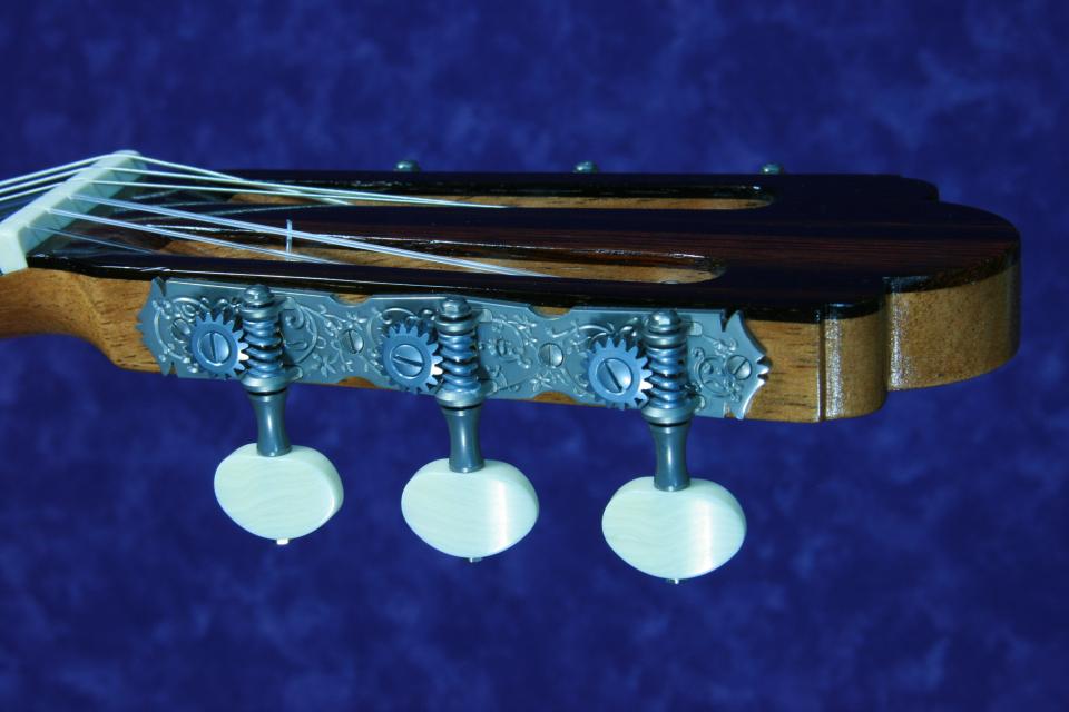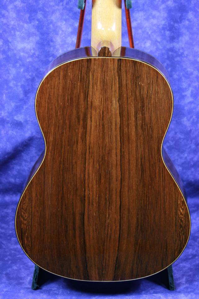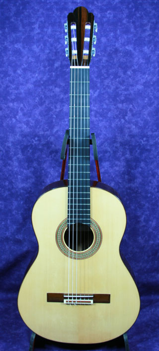 ボディーには、上質のジャーマン・スプルースとマダガスカルローズを使用し、ネックはセドロの本格的スペイン式一本棹で、指板はエボニーを使用しています。ブリッジとヘッドの突き板はハカランダを使用しています。ナットとサドルは象牙です。