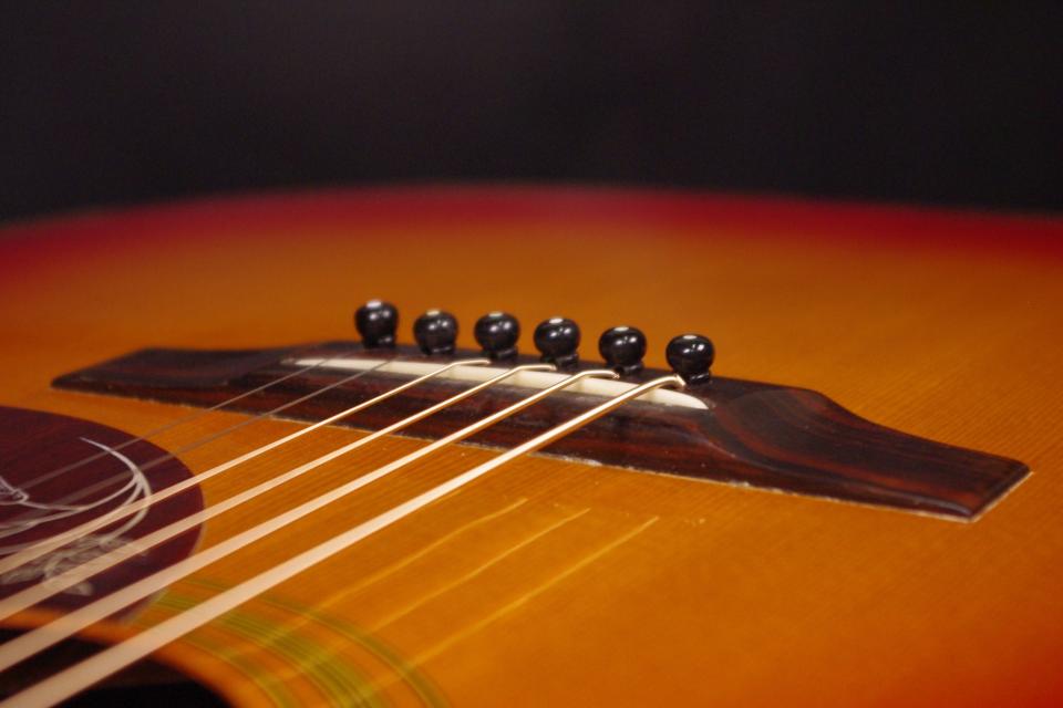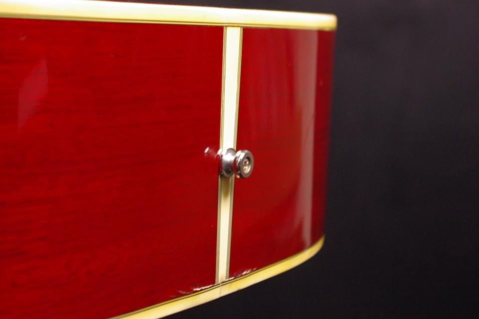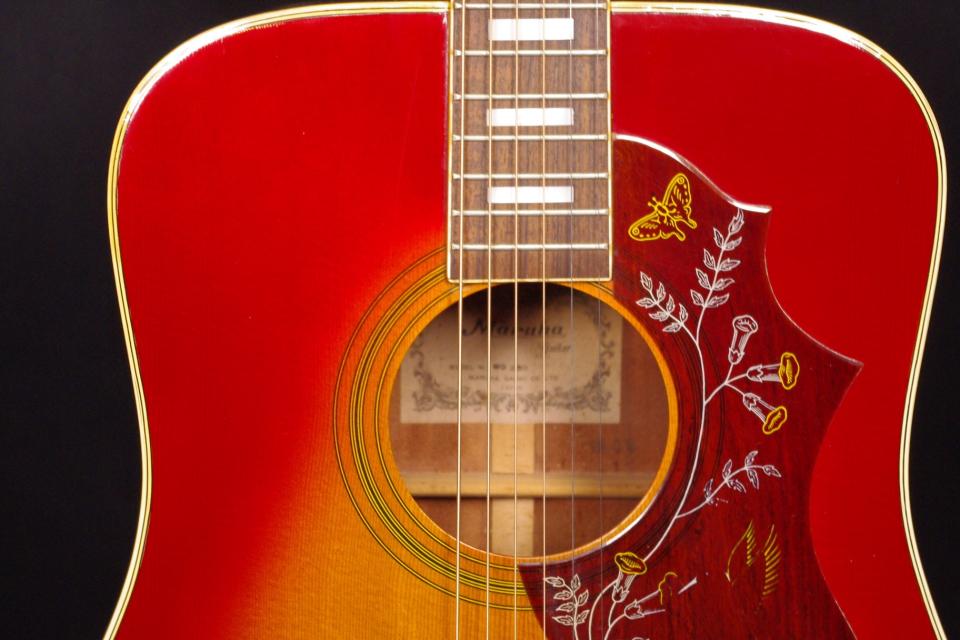 1970年代に生産されたハミングバードのコピーモデル!Gibona WG-250が入荷しました!!トップはスプルース、サイドバックにはマホガニー、指板とブリッジにはローズウッドが有力、ブロックインレイ、ベリーブリッジの1970年代のハミングバードをコピーしています。ペグ、ピックガードはハチドリが消えていますがオリジナルで残っていました。ヘッドの周囲に傷、エンドピン近くのサイドに修理歴があります。全体的に綺麗で美しいチェリーサンバーストが魅力的!ナット幅は約43mmの太すぎないしっかりしたグリップです。アングルは適正でトラスロッドは硬さを感じるところまで締めて調整しています。フレットの減りは少なめで今後も長期で安心いただけます。弦高は12フレット6弦側で約2.7mm、1弦側で約1.9mmの高さでサドルを落として押さえやすく調整してます。ボディは合板になりますが温かく豊かなサウンドで軽いタッチで抜けてくれます!指で弾いてもピックで掻き鳴らしてもバランスが良く応えてくれます!是非この機会にどうぞ!汎用ハードケース付。