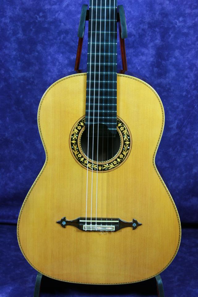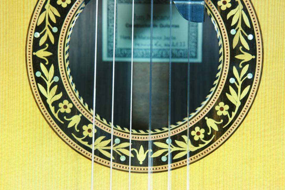 今回、ご紹介するのは表面板はスプルース、横板・裏板はハカランダ(裏板にはローズウッドを重ねております。)、モザイク模様とブリッジはミゲル・ロドリゲス氏のデザインを使った特別仕様のギターです。