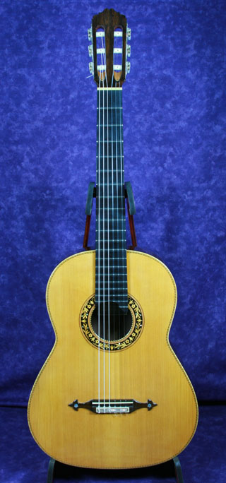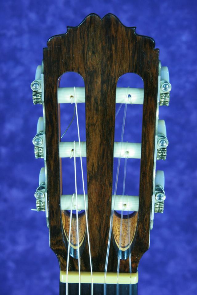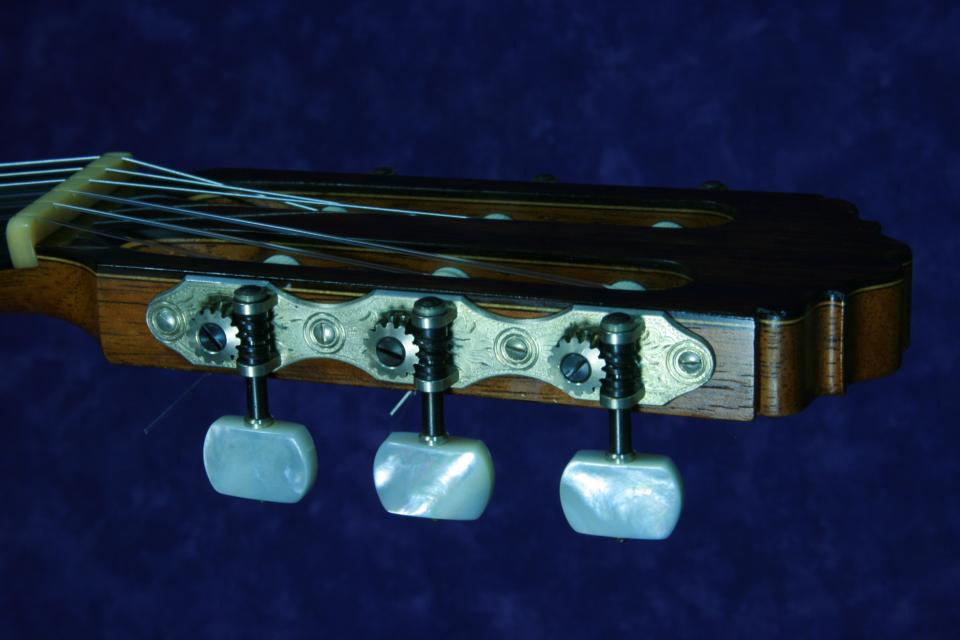 ボディーとのジョイントはスペイン式一本棹で、塗装はセラックの全面タンポ塗りです。 20フレット付きで、糸巻きはルブナー白蝶貝ツマミが付いております。